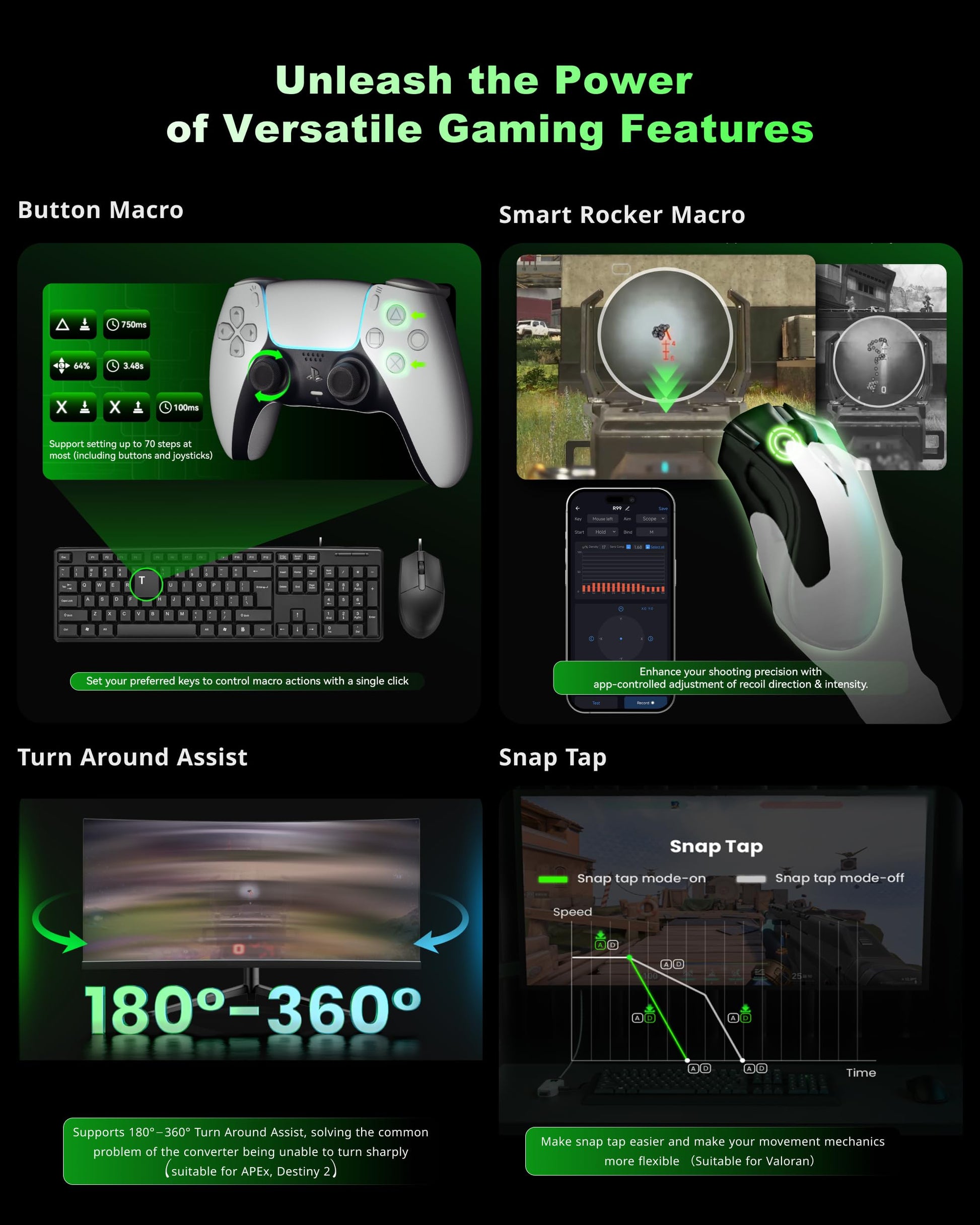 - Q: What unique features does the AX200PRO offer for gamers? A: The AX200PRO includes features such as Smart Rocker, Button Macro, Snap Tap, and 360° Turn Around Assist, which collectively enhance precision and control during gaming.