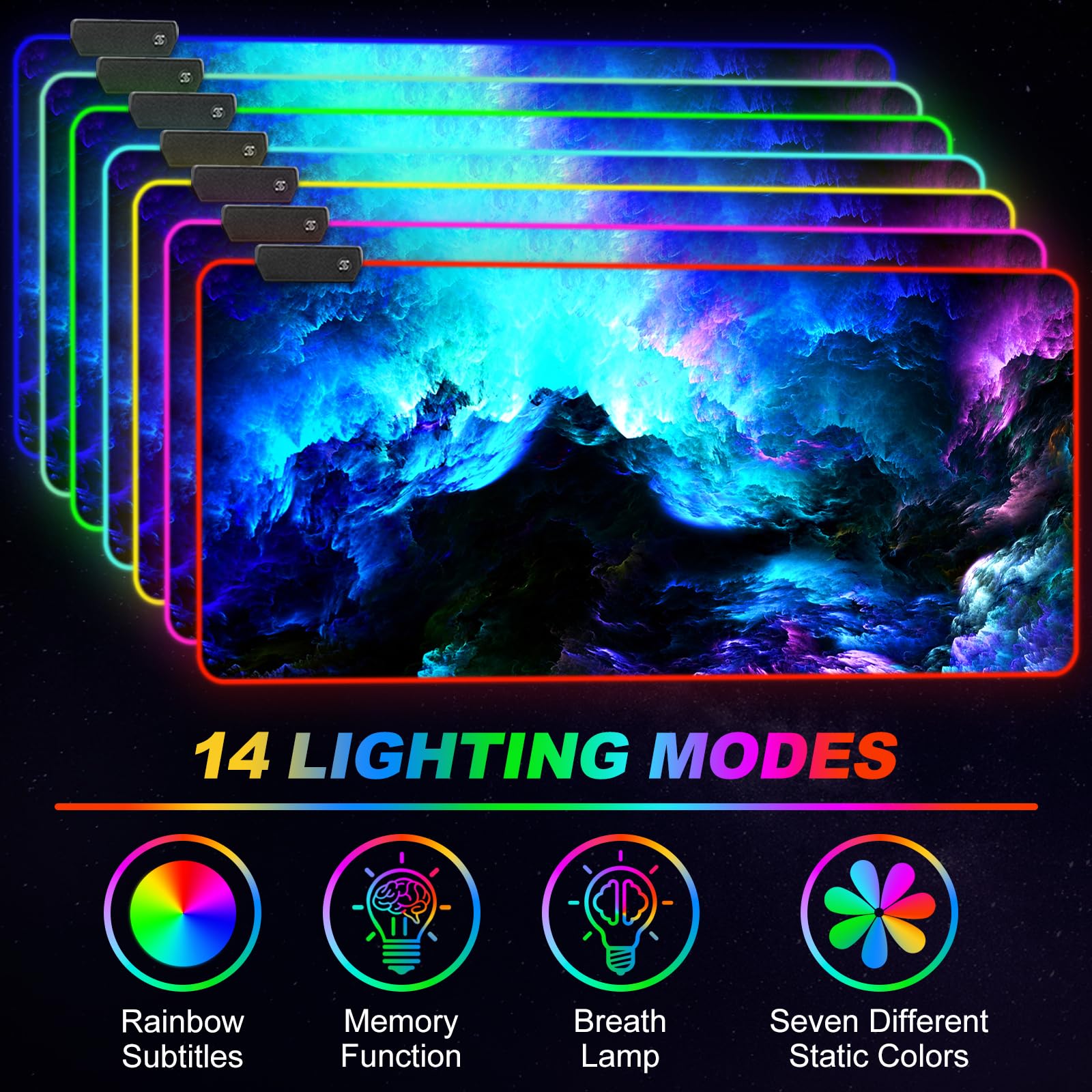 - Q: How many lighting modes does the mouse pad have? A: This gaming mouse pad features fourteen different lighting modes, including seven static colors and various dynamic effects.