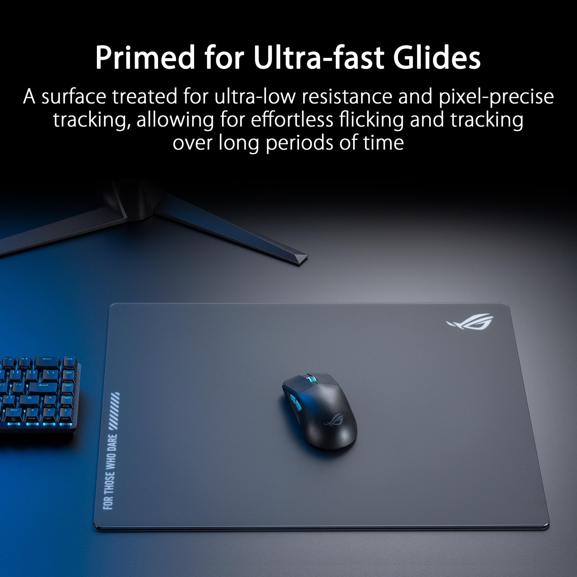- Q: What are the specific features of the ASUS ROG Moonstone Ace mouse pad? A: Key features include a noise-reducing design for quiet operation, exceptional durability with scratch-resistant glass, a full anti-slip silicone base for stability, and a large size of five hundred by four hundred millimeters.