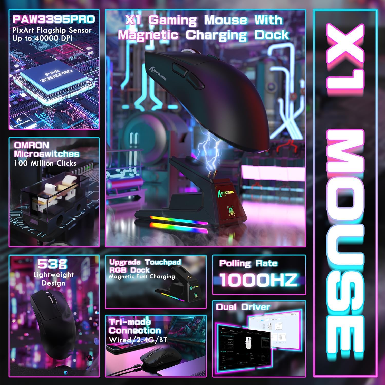 - Q: How does the RGB charging dock work with the mouse? A: The RGB charging dock for the ATTACK SHARK X1 features dynamic lighting effects that can be adjusted using upgraded touchscreen controls. The mouse charges seamlessly when placed on the dock.