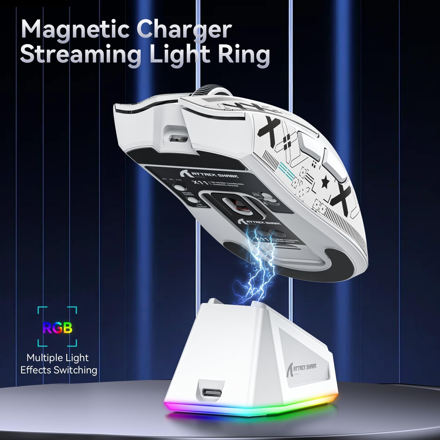 - Q: How can I customize the RGB lighting on the charging dock? A: The magnetic charging dock of the ATTACK SHARK X11 mouse features touch-sensitive RGB lighting control, allowing users to customize their lighting setup with a simple tap.