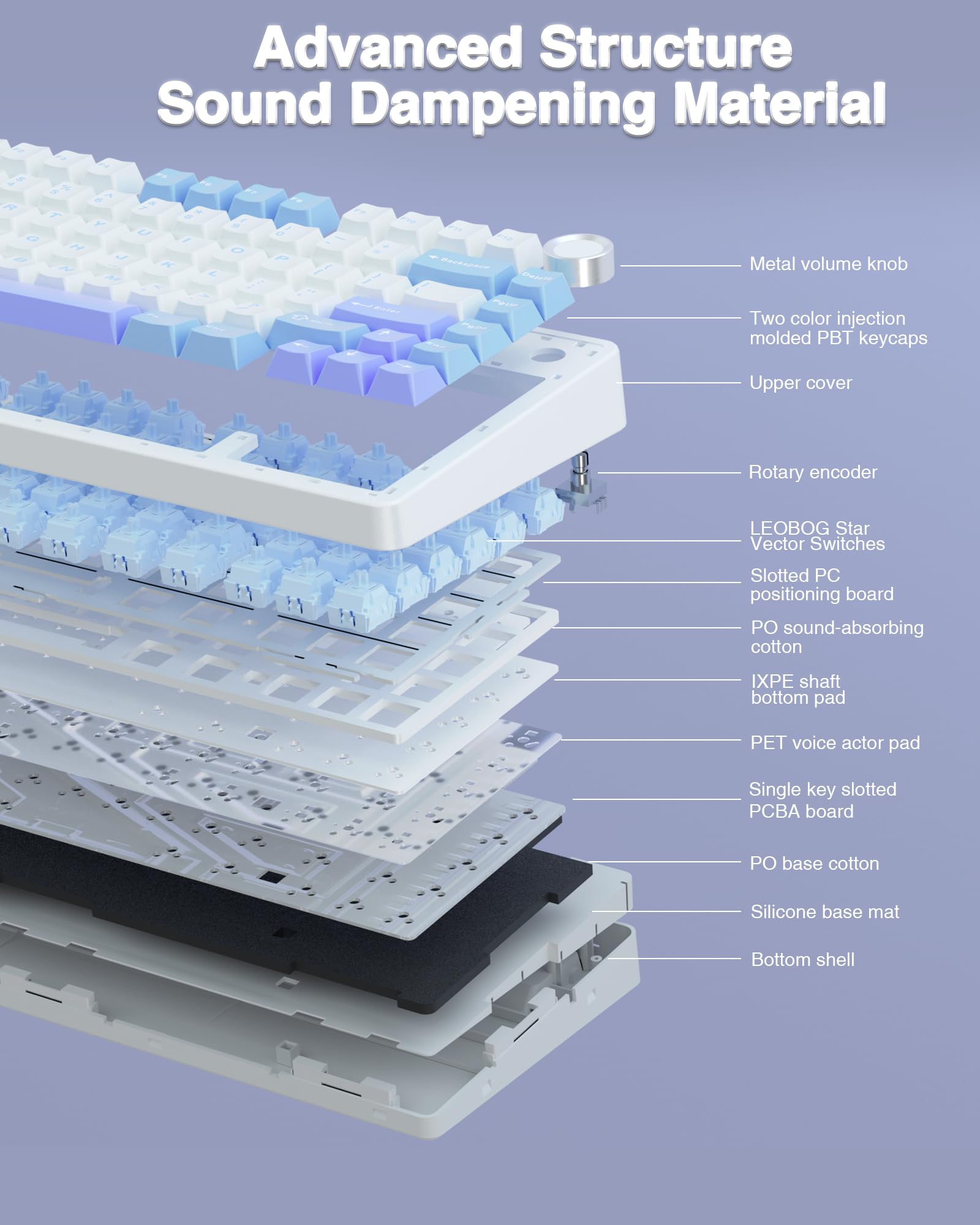- Q: What materials are used in the construction of the AULA F75 keyboard? A: While specific materials are not detailed, the AULA F75 keyboard is designed with advanced structure features including an integrated silicone pad for improved resilience and stability.