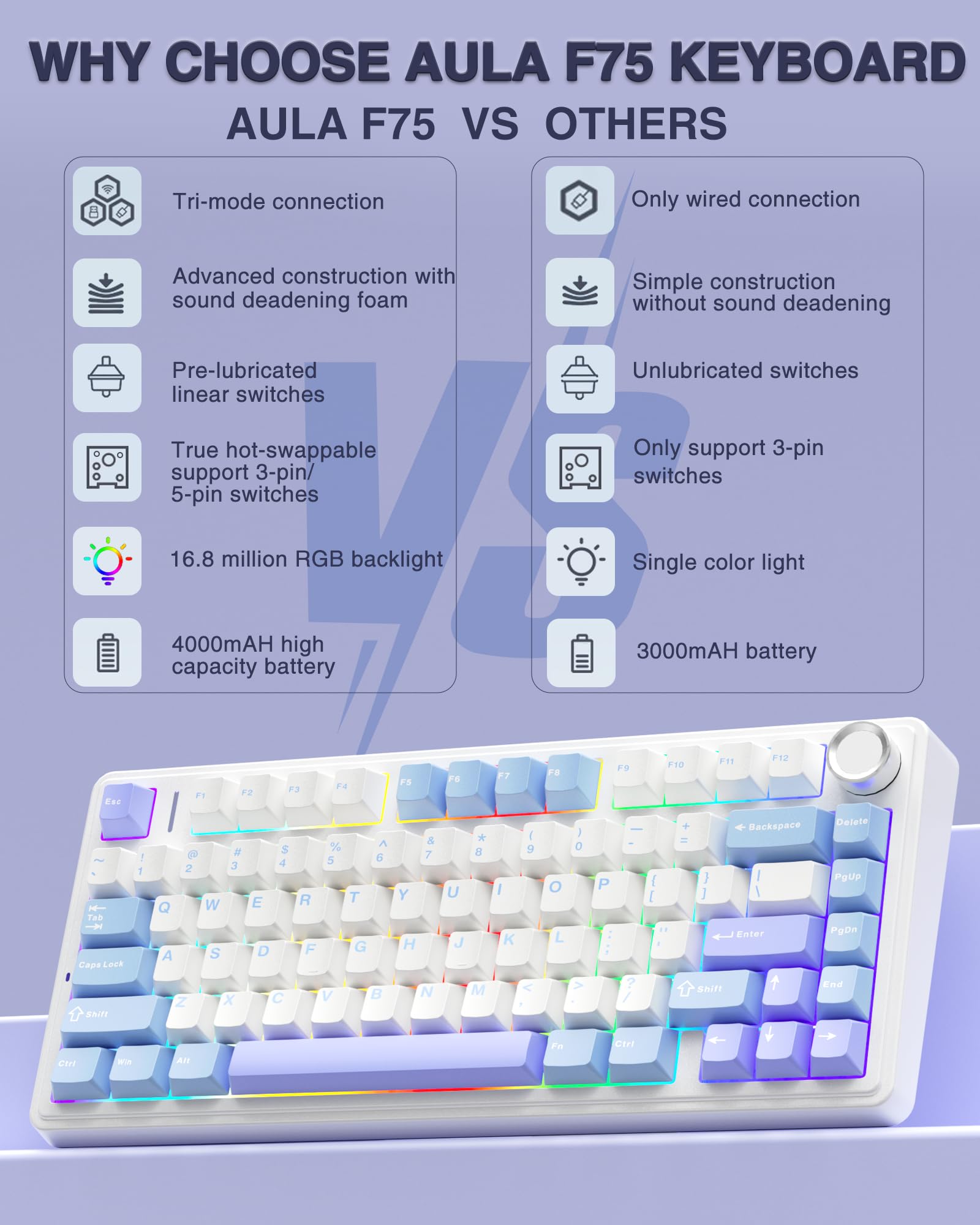 - Q: Can I customize the switches on the AULA F75 keyboard? A: Yes, the AULA F75 features a hot-swappable base that supports both 3-pin and 5-pin switches, allowing users to easily customize or replace the switches without soldering.