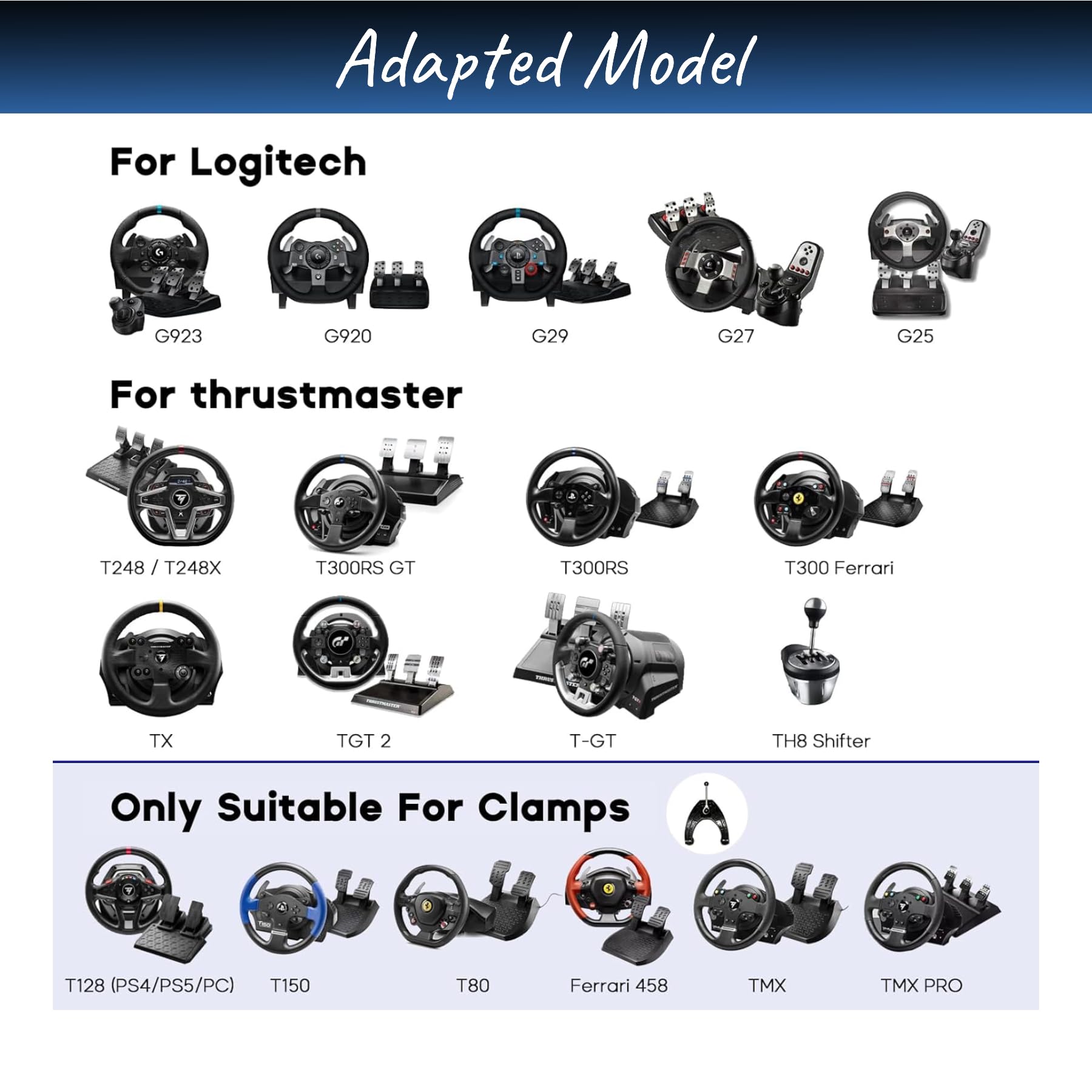 - Q: Which racing wheels are compatible with the stand? A: The stand is compatible with popular racing wheels, including Logitech G920, G27, G25, G29, and Thrustmaster models such as T80, T150, TX, and F430.