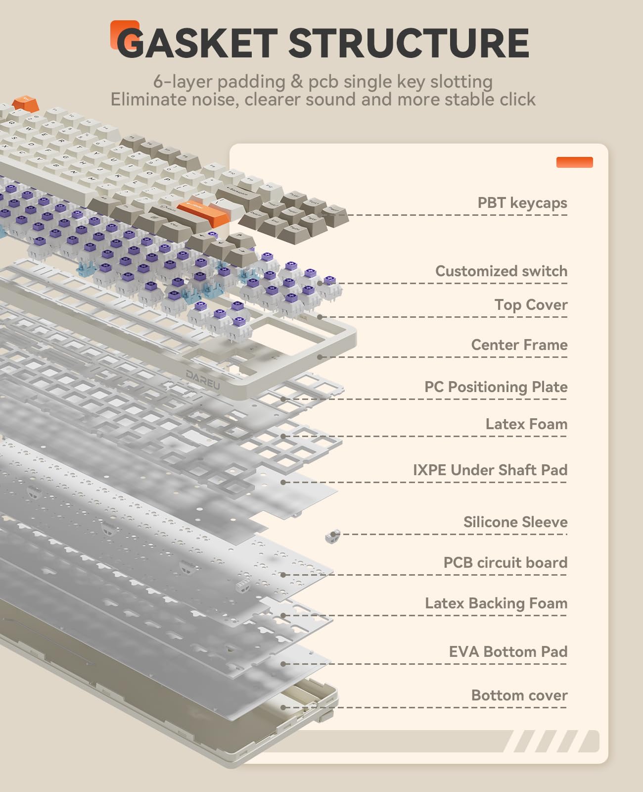 - Q: How does the gasket mount design benefit the keyboard's performance? A: The gasket mount design of the DAREU EK87PRO enhances the overall feel and acoustics by providing better cushioning, reducing vibrations, and improving sound quality during typing.