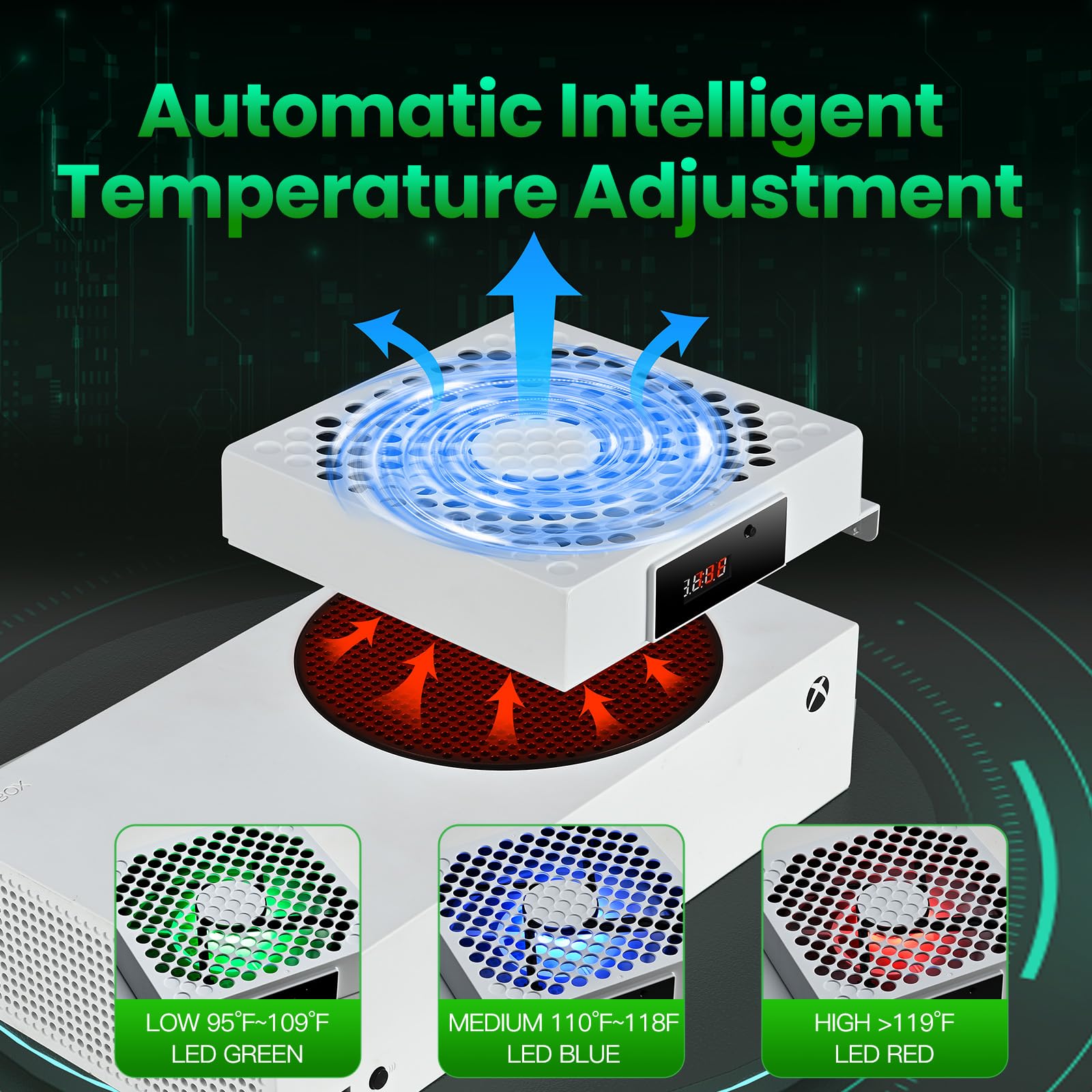 - Q: How does the temperature display work on this cooling fan? A: The LED temperature display screen shows the real-time temperature of your Xbox Series S console. It helps users monitor the console's temperature to prevent overheating and extend its lifespan.