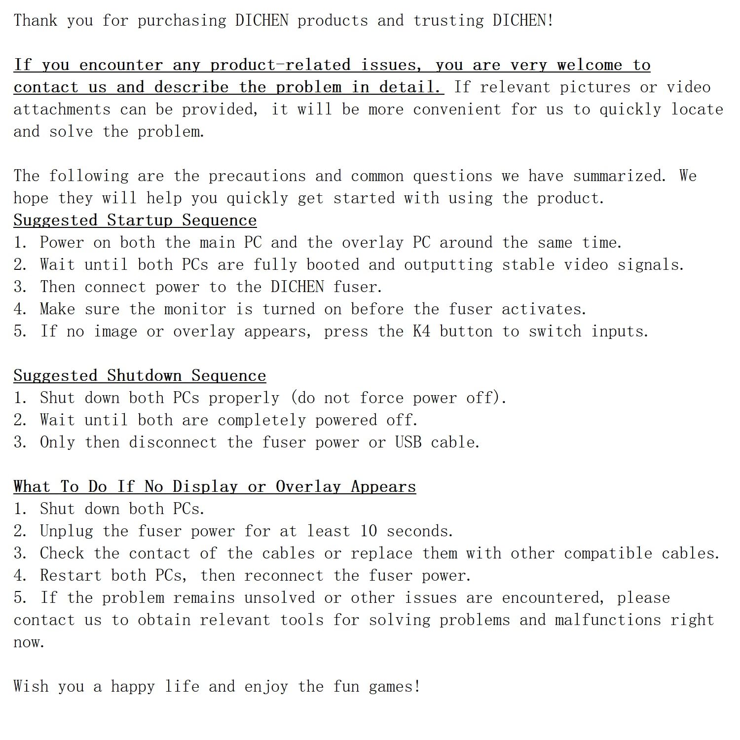 - Q: Can the device handle multiple input signals? A: Yes, the DICHEN DMA Fuser Combiner supports two input signals, allowing you to output and blend both onto a single display.