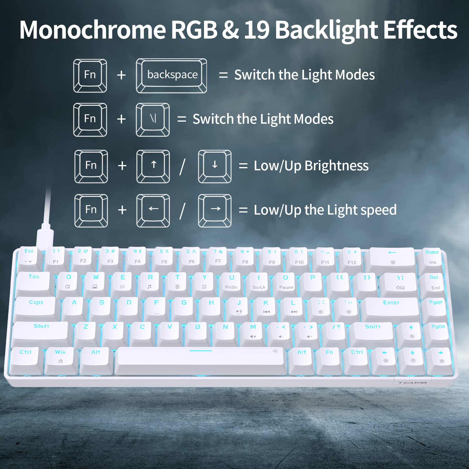 - Q: What lighting options are available on the DIERYA T68SE? A: The DIERYA T68SE offers a variety of RGB backlighting options, including nineteen built-in lighting modes, with customizable brightness and speed settings.