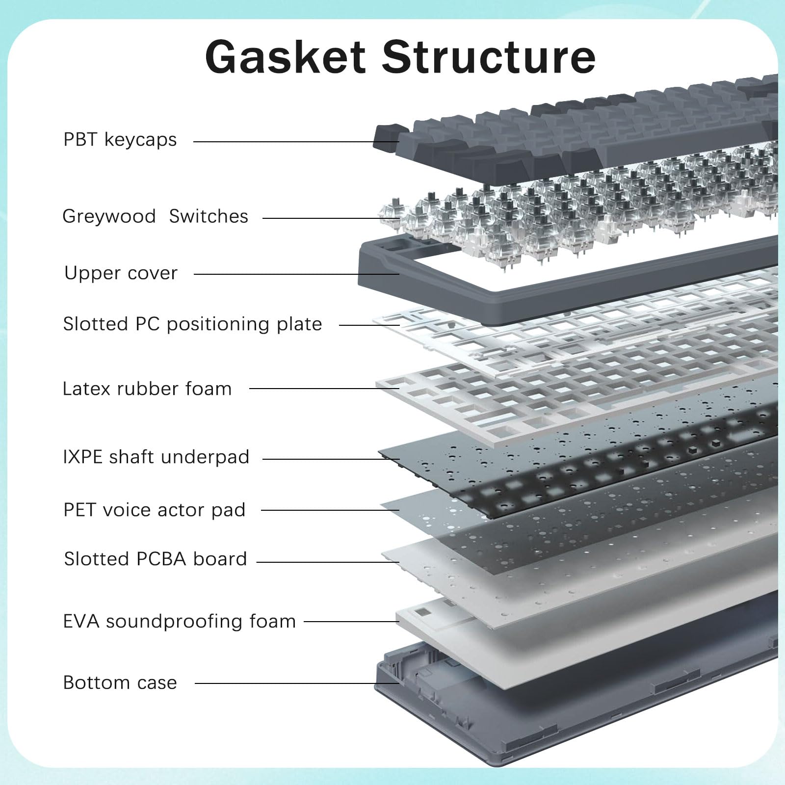 - Q: How does the gasket structure benefit the keyboard's performance? A: The gasket structure enhances the keyboard's durability and stability by using four layers of thicker sound-absorbing foams and a silicone dampener pad, which significantly reduces noise and hollow sound for a better typing experience.