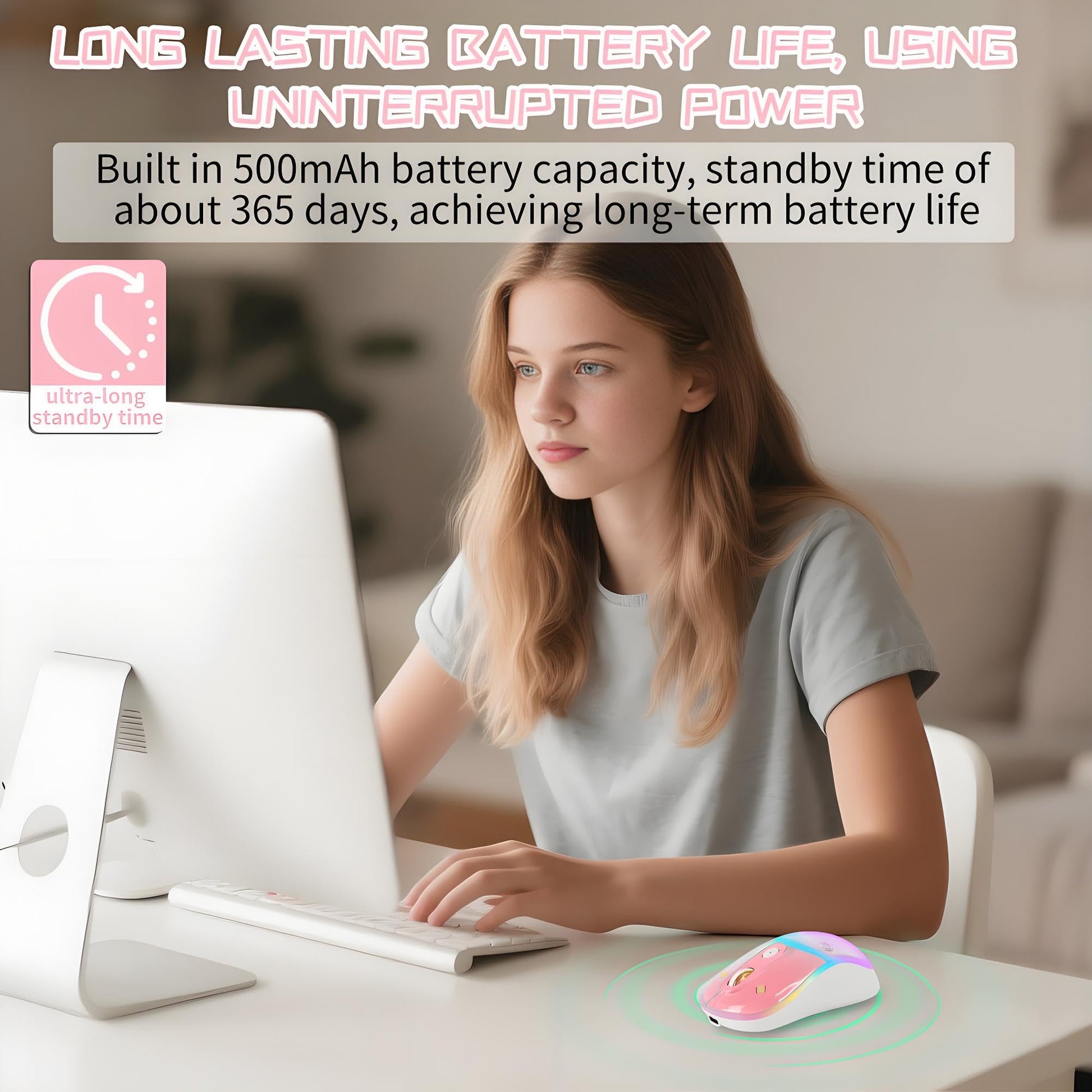 - Q: How long does the battery last on the elec Space Cute Wireless Bluetooth Mouse? A: The mouse is equipped with a 500mAh rechargeable battery. It offers approximately 365 days of standby time, around 15 days of active use with the RGB lights on, and about 90 days of use with the lights off.