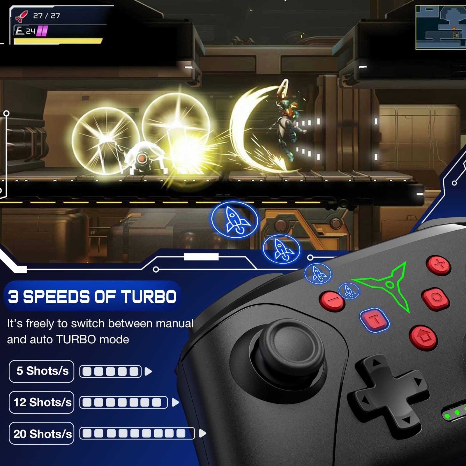 - Q: What features does the Wireless Switch Controller offer? A: The controller includes features such as a turbo function with adjustable speed, high sensitivity buttons, dual-motor vibration, motion control, and a screen capture function to enhance gaming experiences.