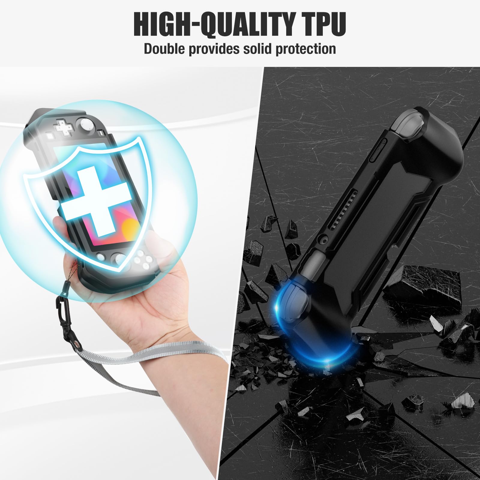 - Q: How does the dual protection feature work? A: The dual protection feature includes separate top and bottom covers that shield the Nintendo Switch Lite from scratches, dust, bumps, and drops, providing comprehensive 360° protection.