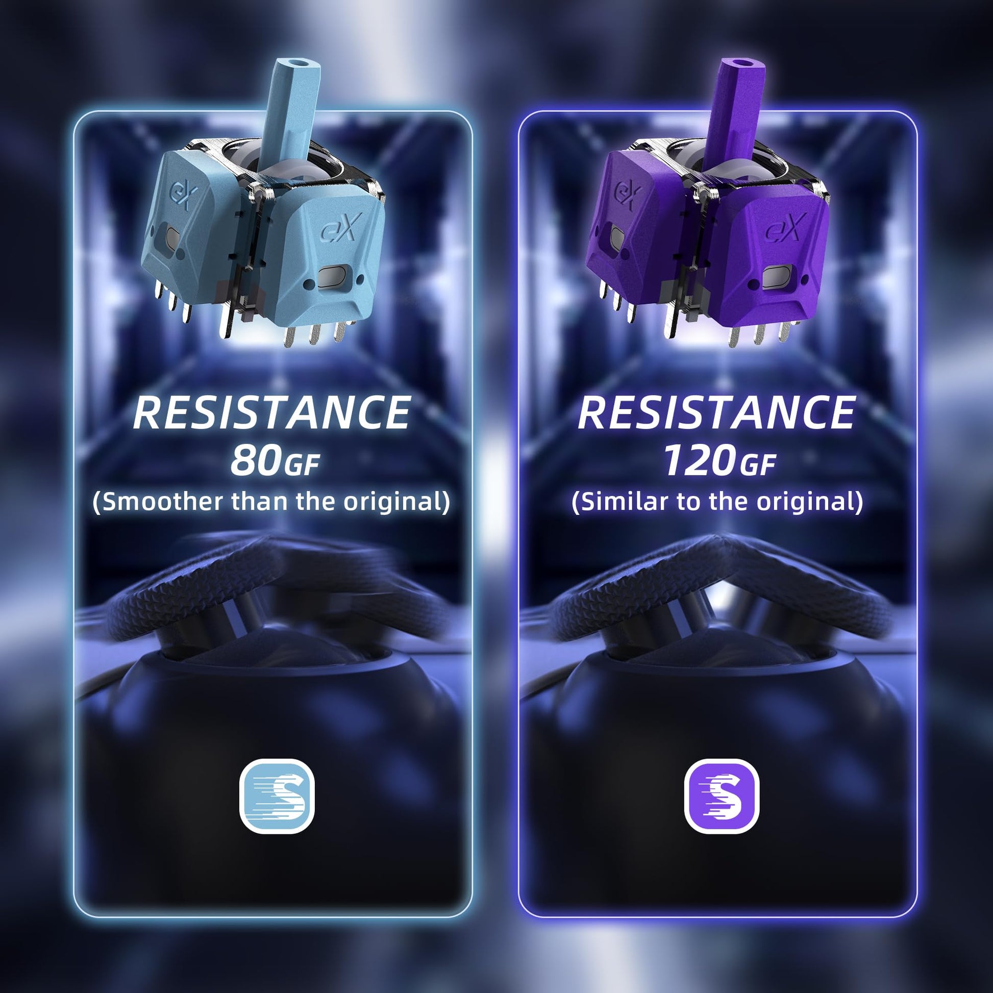 - Q: What is the resistance of the blue variant of this thumbstick kit? A: The blue variant of the eXtremeRate eXhall Thumbstick Kit features a resistance of eighty grams (80gf), which helps in achieving smoother and more effortless control during gameplay.