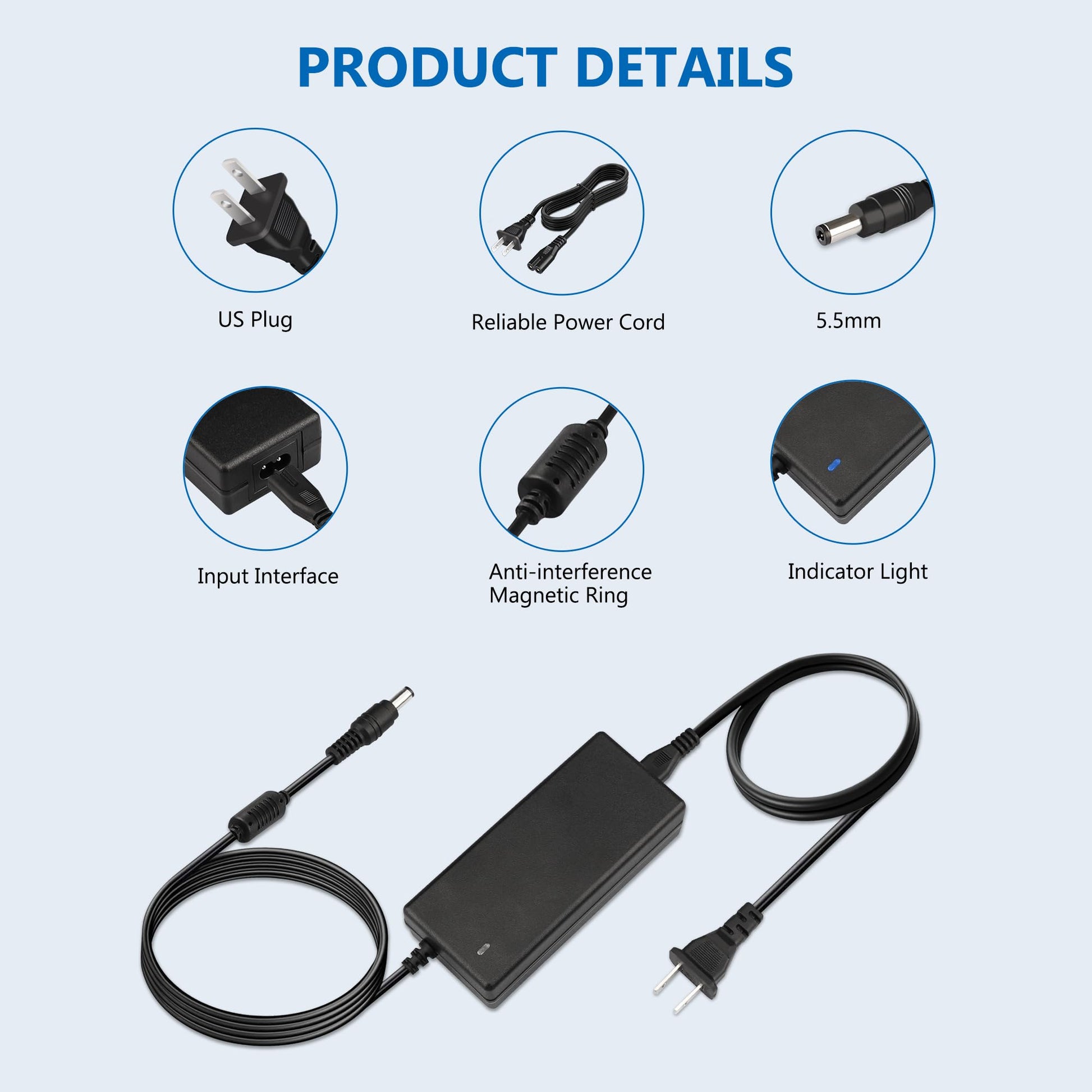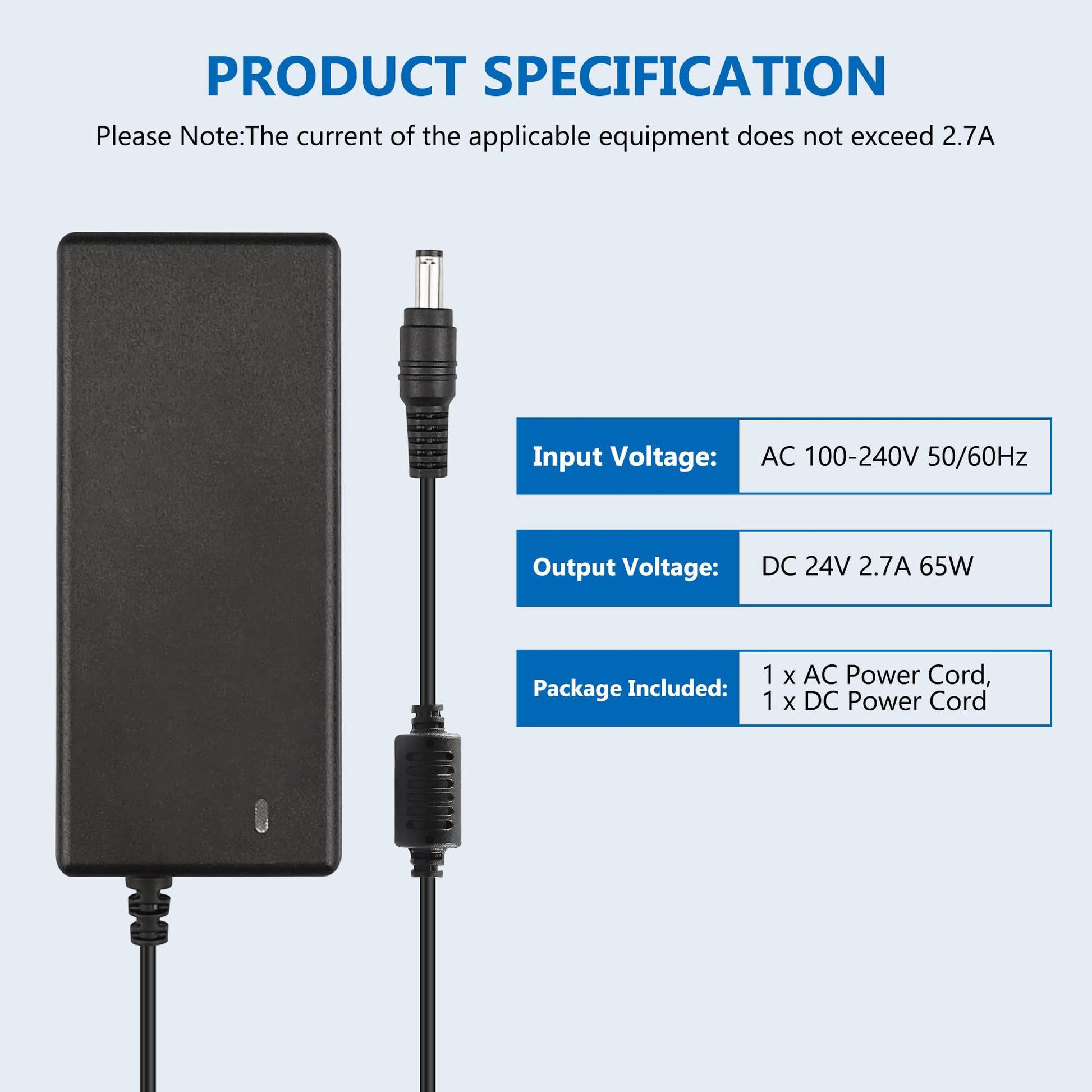 - Q: What is the power output specification of this power adapter? A: The power adapter provides a DC output of twenty-four volts at two point seven amps, with a maximum power of sixty-five watts.