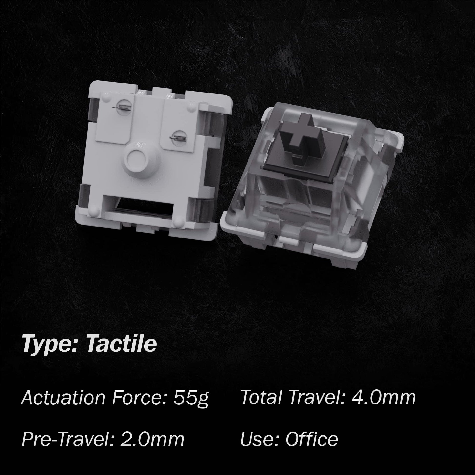 - Q: What is the actuation force for the Gateron Brown switches? A: The Gateron Brown switches have an actuation force of fifty-five grams. They are tactile switches, providing a noticeable bump on each keystroke.