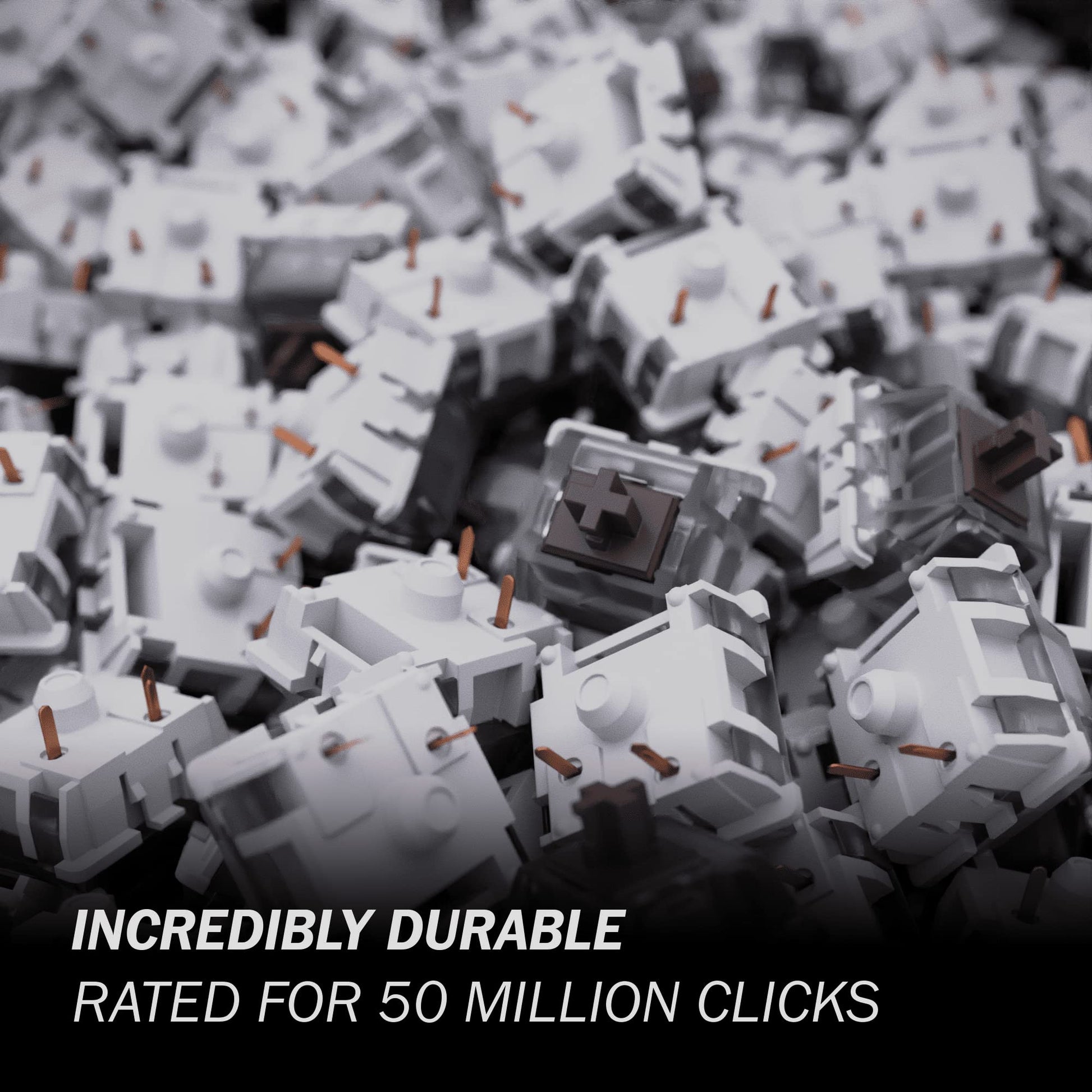 - Q: What is the durability rating of Gateron KS-9 switches? A: Gateron KS-9 switches have a durability rating of fifty million keystrokes, making them highly reliable for long-term use.