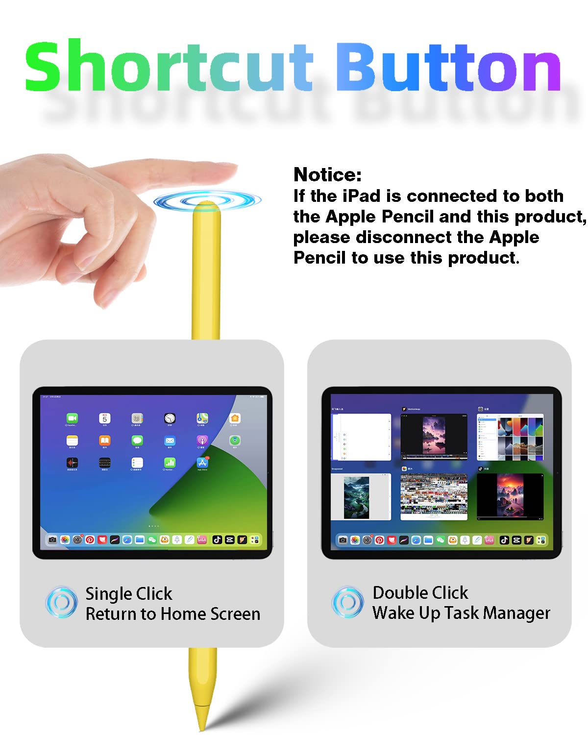 - Q: How do I perform shortcut functions with the Gnanlen iPad Pencil? A: After connecting the Gnanlen iPad Pencil to Bluetooth, you can tap the button at the top to access shortcut functions. One tap returns you to the main screen, while double-tapping brings up the app selection page.