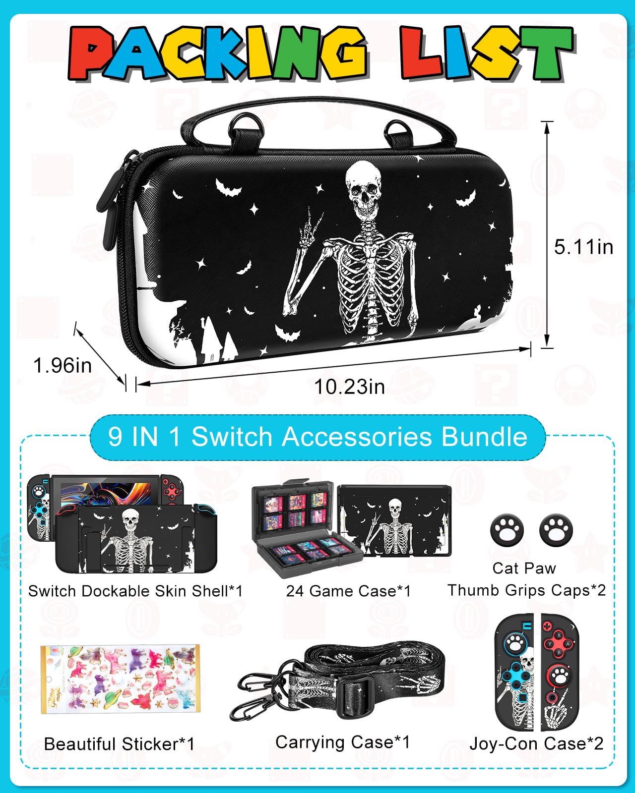 - Q: What accessories are included in the Gurgitat 9 in 1 Switch Accessories Bundle? A: The Gurgitat 9 in 1 Switch Accessories Bundle includes a goth skeleton Switch travel protective bag, a dockable skin shell, two Joy-Con bumper covers, a game card holder organizer, two cat paw thumb grips, a shoulder strap, and a sticker.