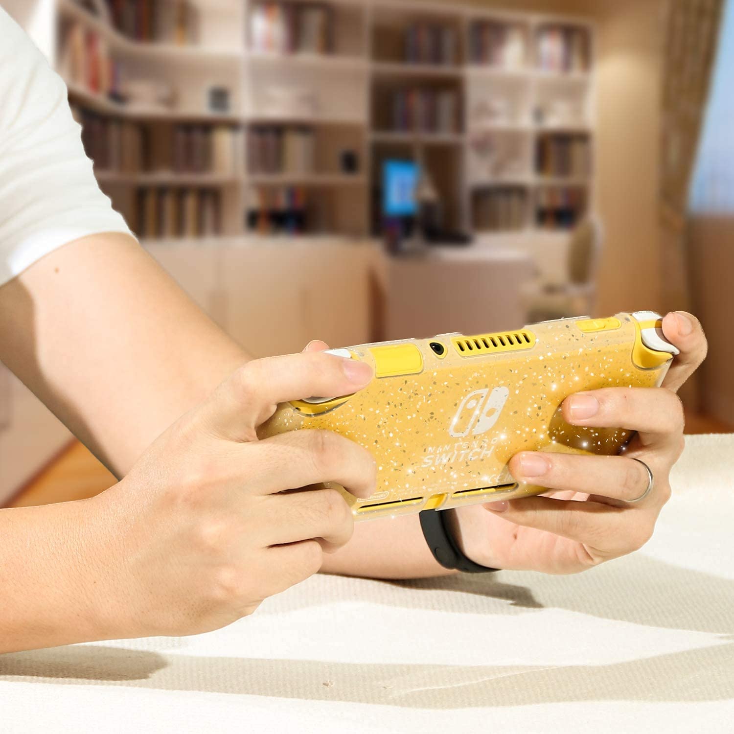 - Q: What colors are available for the Switch Lite Case? A: The case is available in a clear color with a glittery finish, which allows for the display of your console's original color while adding a stylish touch.