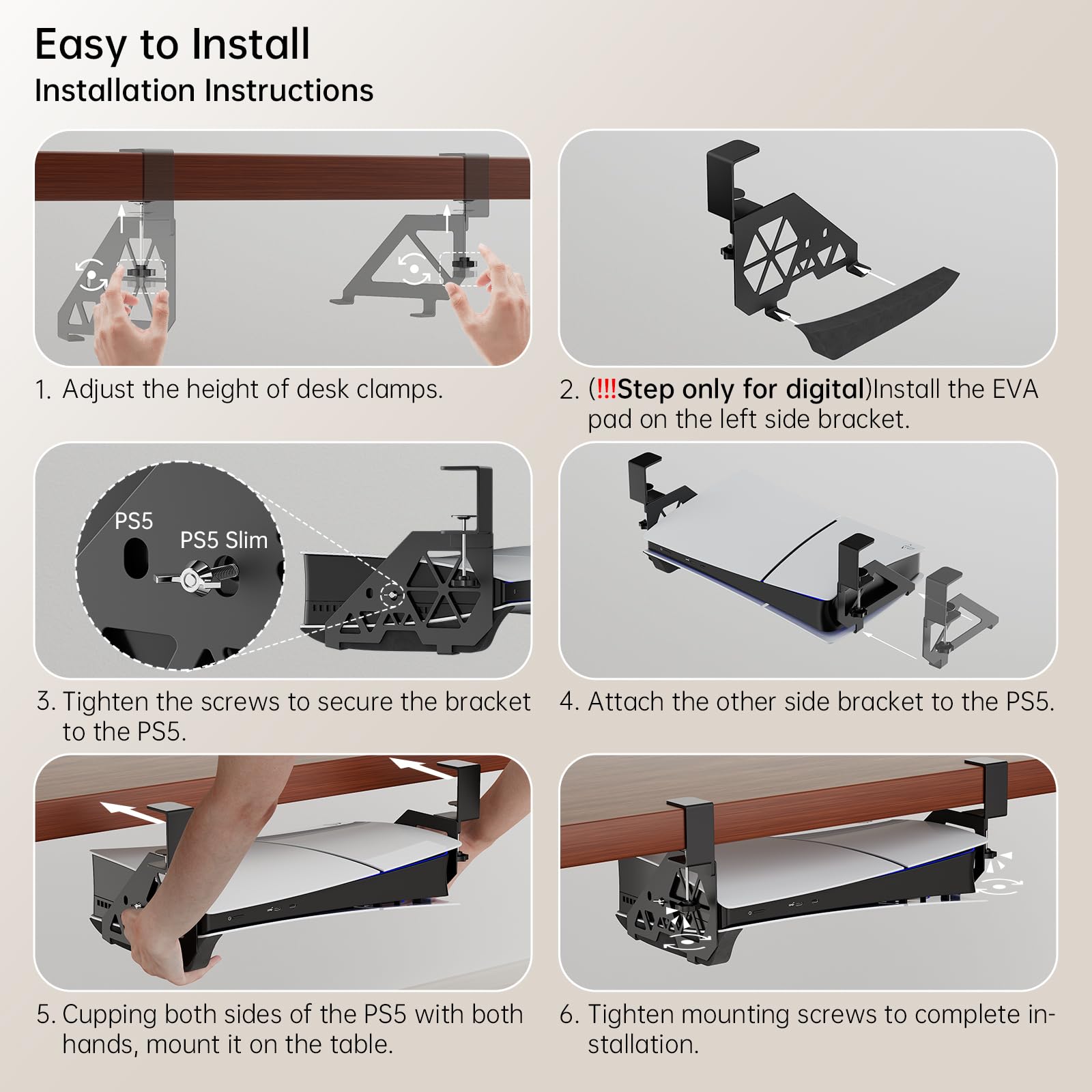 - Q: How do I install the Hosanwell PS5 Under Desk Mount? A: Installation is simple: use the included clamps and screws to securely attach the mount to the edge of your desk without drilling. Detailed instructions are provided in the packaging.