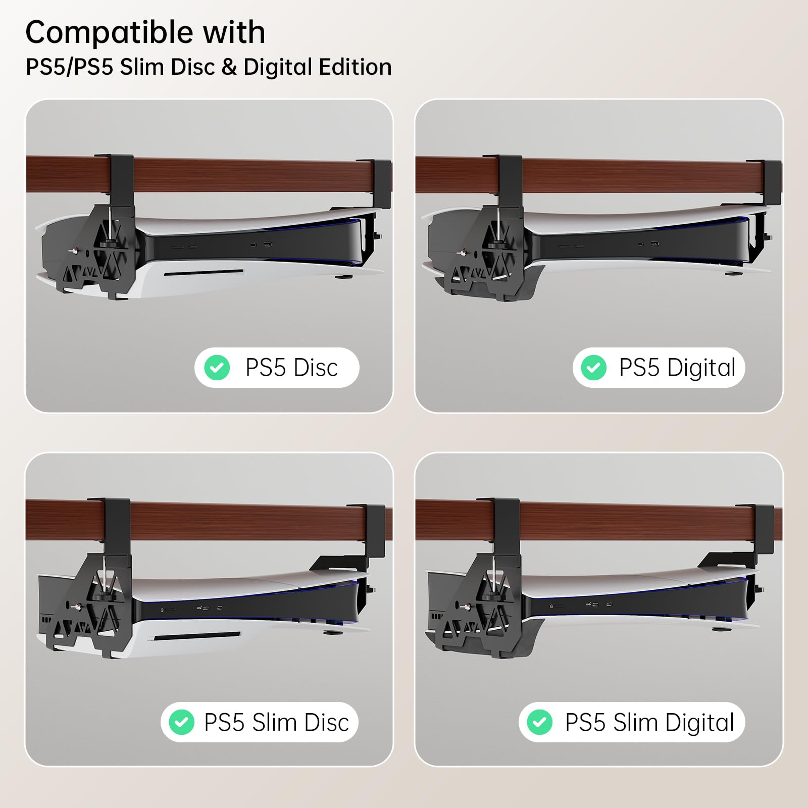 - Q: Is this mount compatible with both digital and disc versions of the PS5? A: Yes, the Hosanwell PS5 Under Desk Mount is compatible with both the digital and disc versions of the PS5 and PS5 Slim consoles.