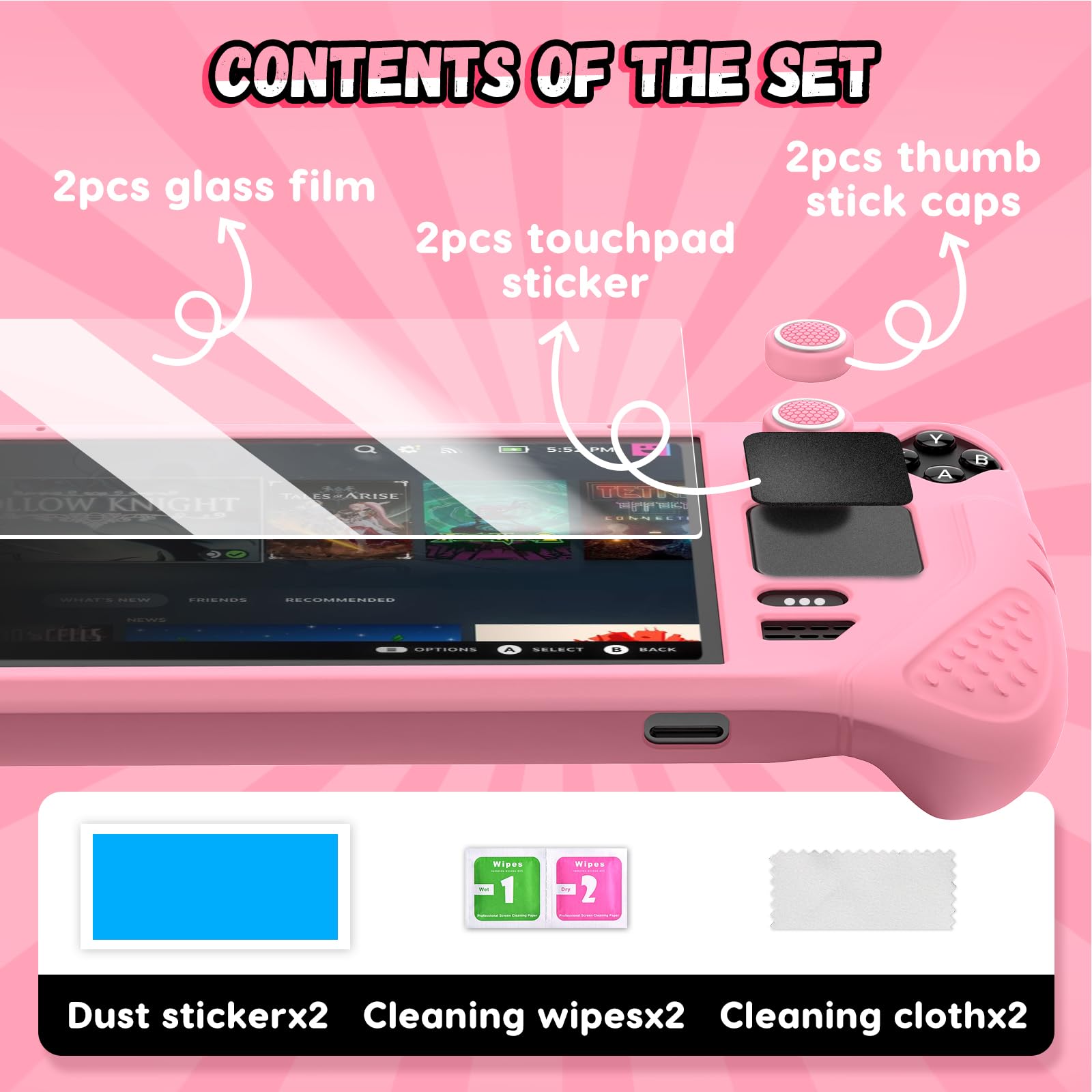 - Q: Does the case come with any accessories? A: Yes, the IINE Steam Desk Protective Case package includes a silicone case, two glass films, a cleaning set, two trackpad films, and two thumb joystick caps, providing comprehensive protection and maintenance options.