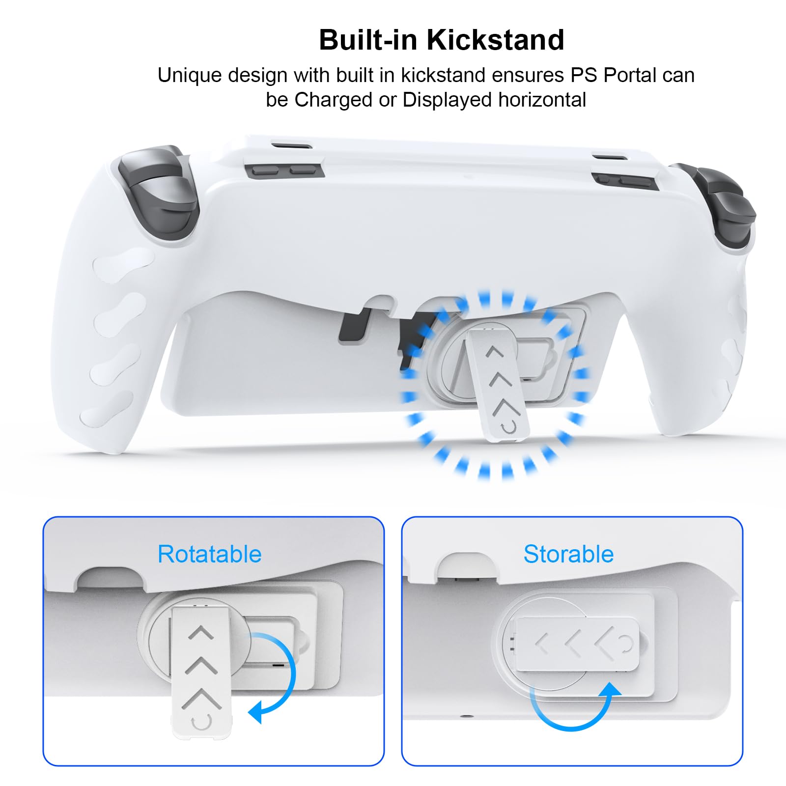 - Q: How does the kickstand work on the back cover? A: The kickstand on the back cover allows users to prop the PlayStation Portal Remote Player up on a flat surface, enabling hands-free gaming or screen viewing.