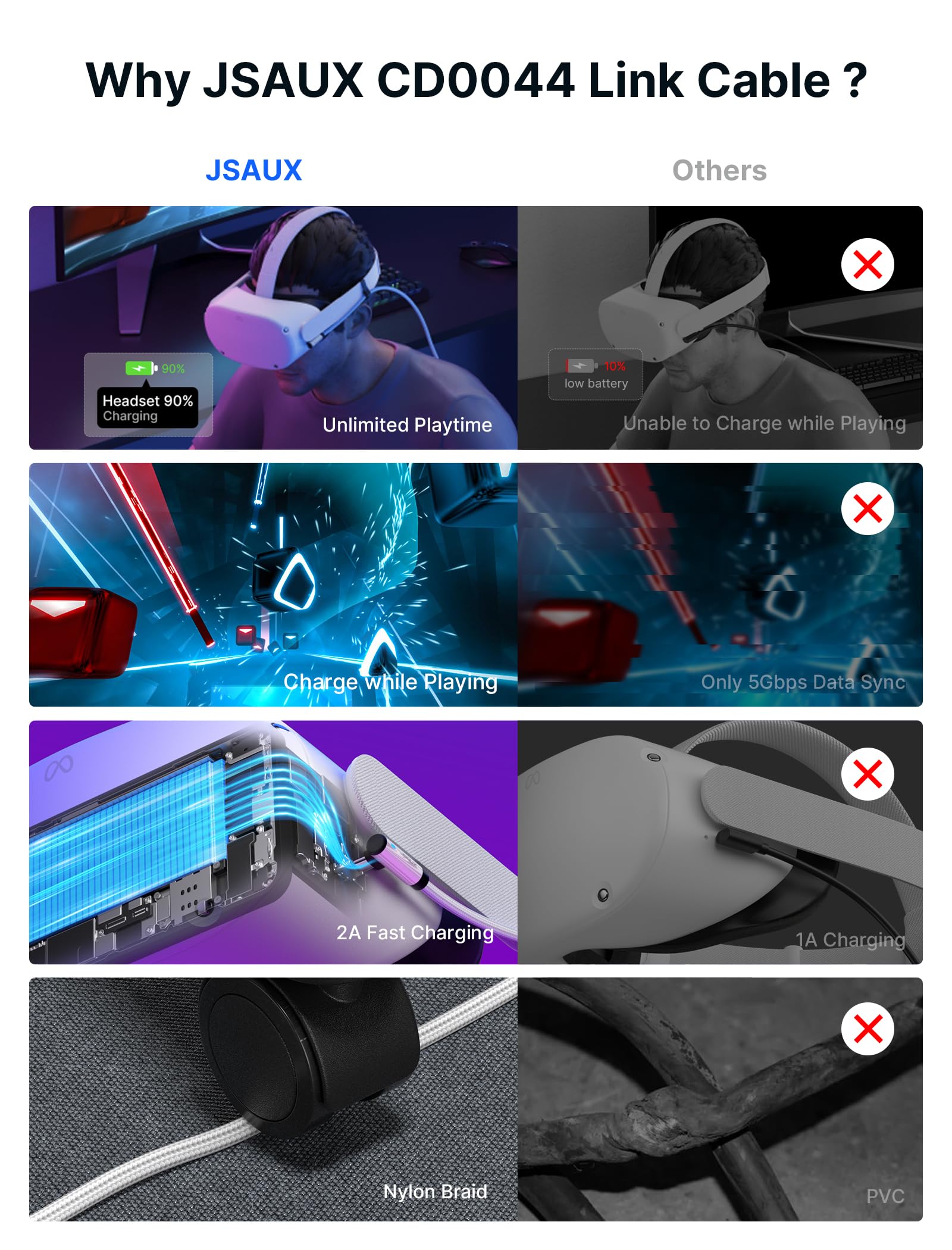 - Q: Can I use this cable with Pico 4? A: No, the JSAUX Link Cable is not compatible with charging while playing on Pico 4; however, it can be used separately for charging and VR experiences.