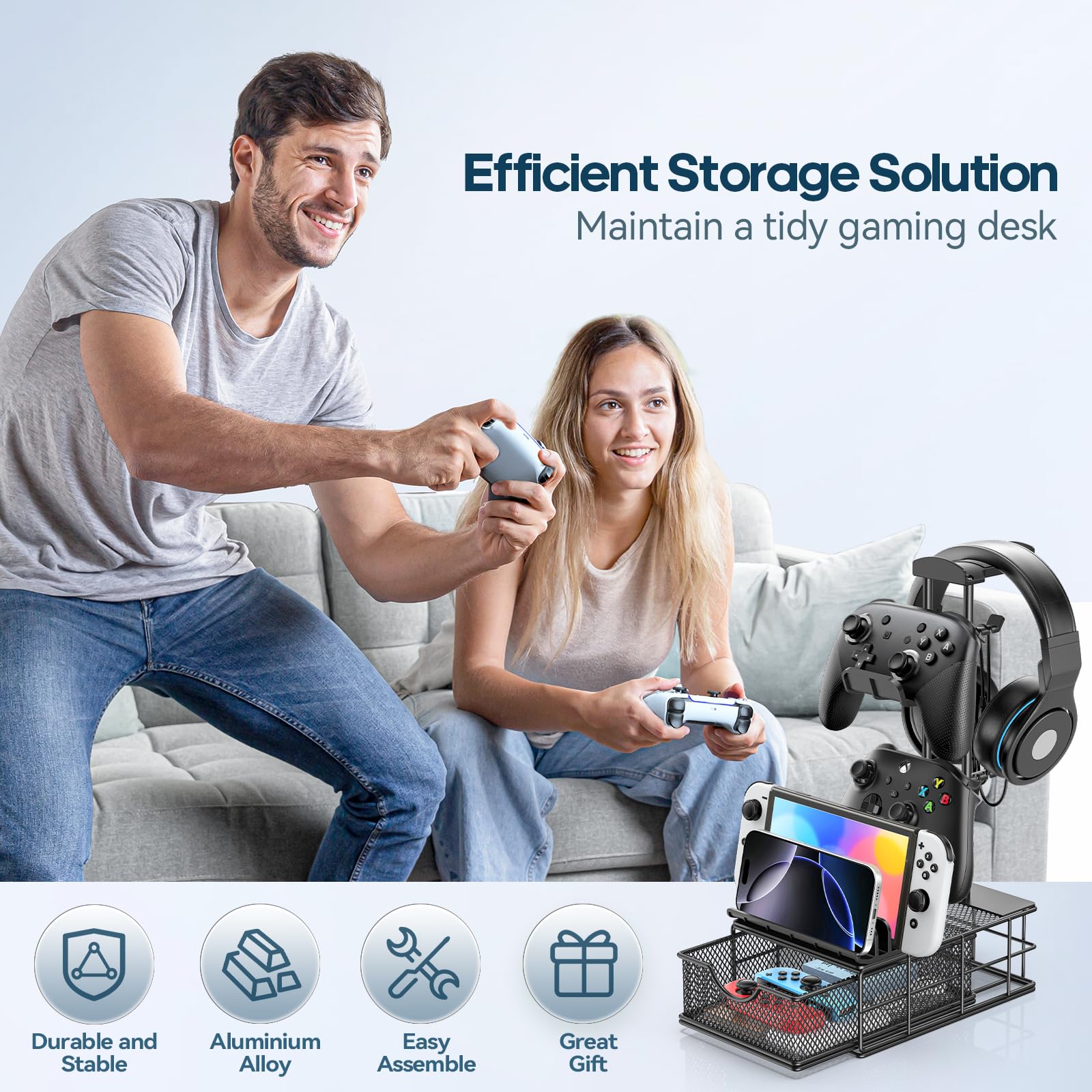 - Q: What type of storage does the KDD Headphone Stand offer? A: The KDD Headphone Stand features a drawer for additional storage, allowing you to keep device chargers, gaming accessories, and other items organized and within reach.