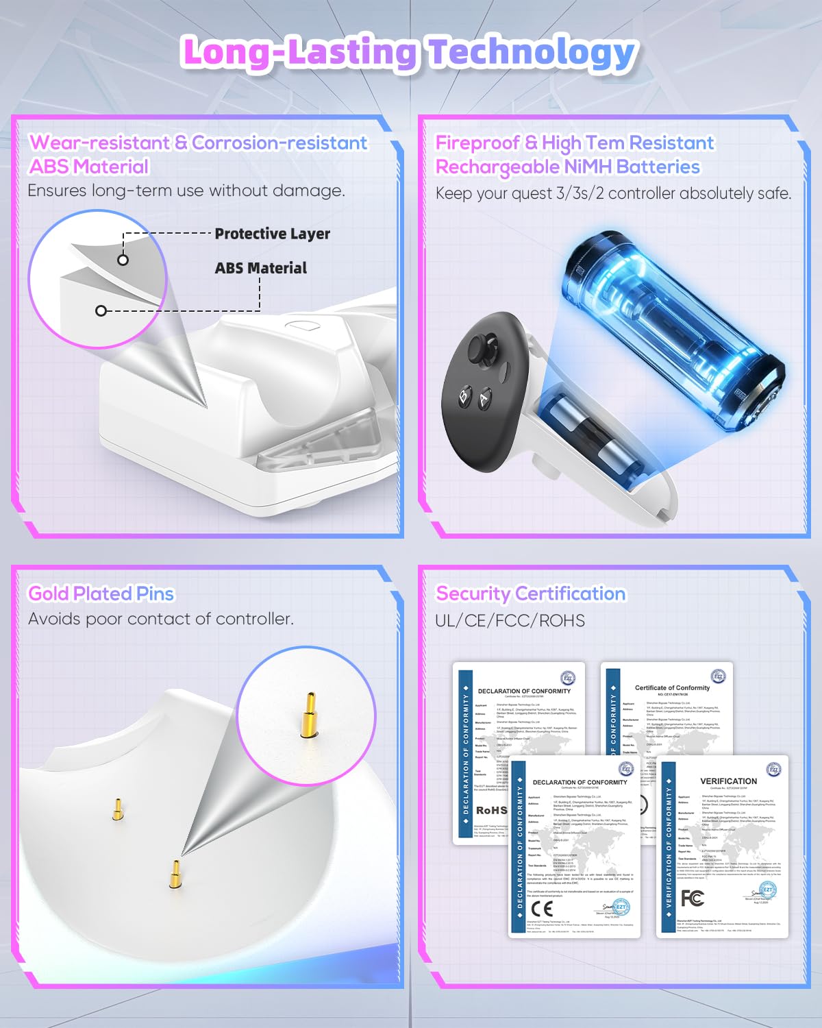 - Q: How long does it take to charge the headset and controllers? A: The dock charges the headset in approximately two hours and the controllers in about three and a half hours, making it 33.3% faster than other charging docks.