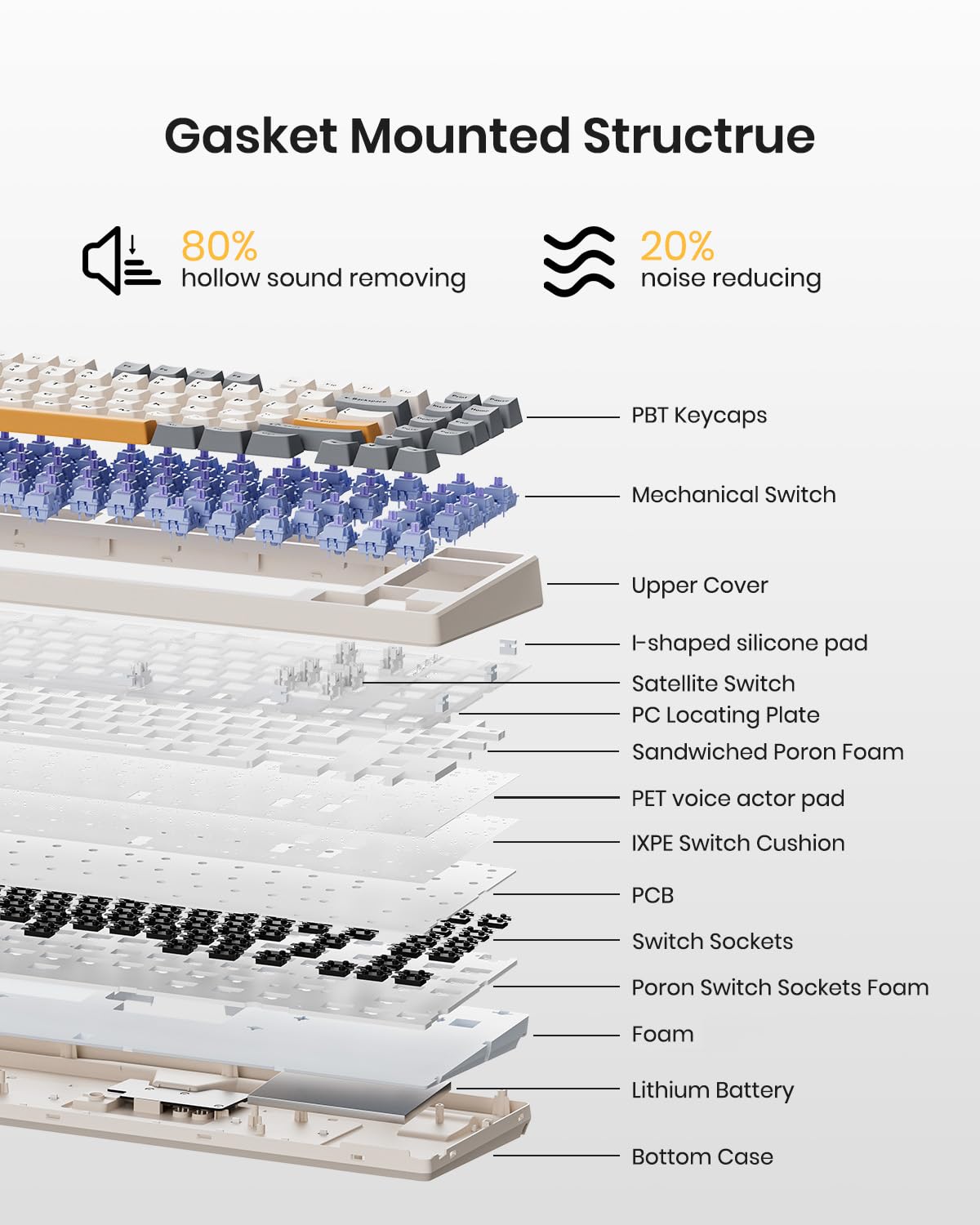 - Q: What materials are used in the construction of the Kisnt keyboard? A: The Kisnt Wireless Mechanical Keyboard features durable PBT keycaps that enhance its longevity. The design also incorporates sound-dampening foam layers for a quieter typing experience.