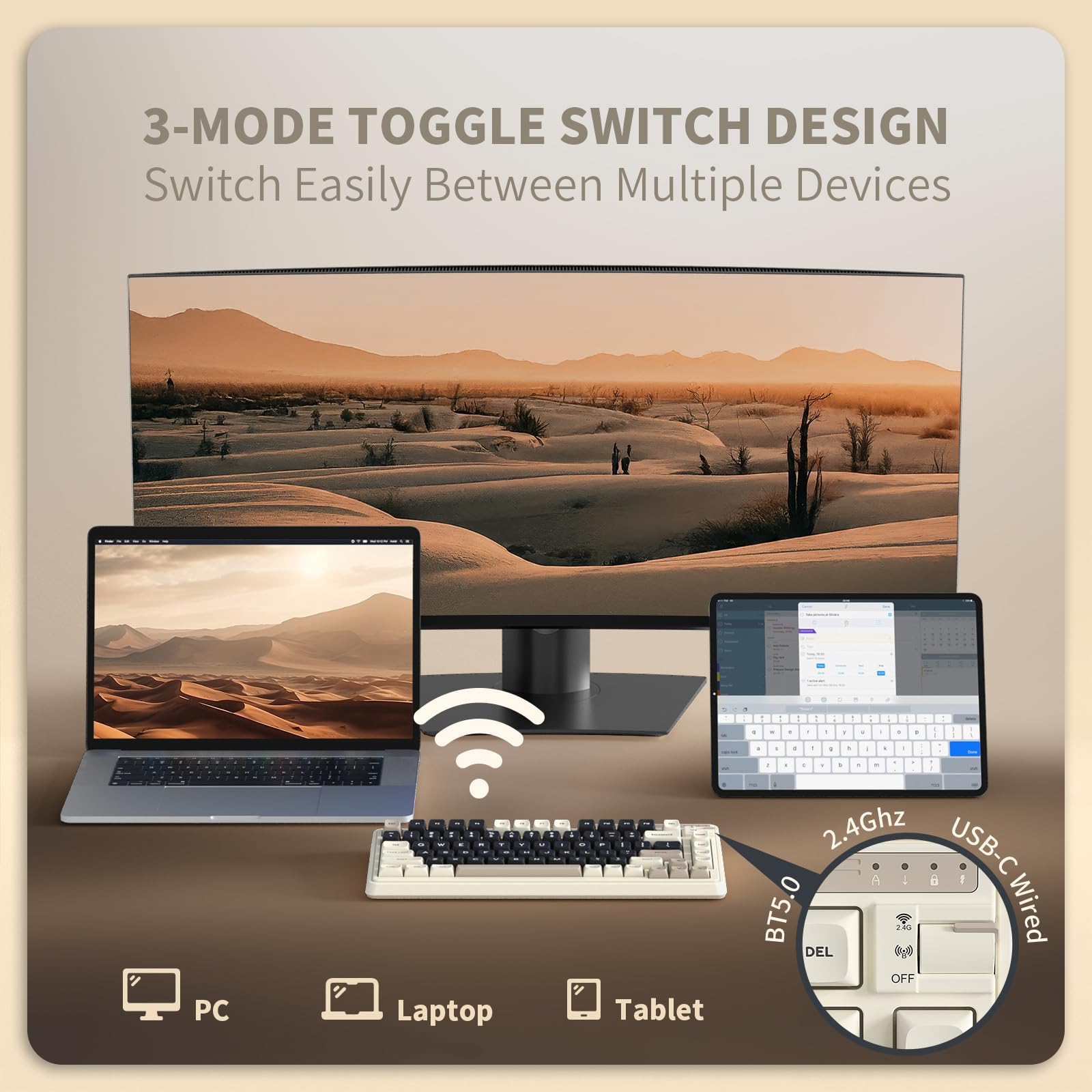 - Q: Can I connect the KZZI K75 Lite to multiple devices? A: Yes, the keyboard can connect to up to five devices simultaneously through its tri-mode connectivity options, allowing for easy switching between devices.