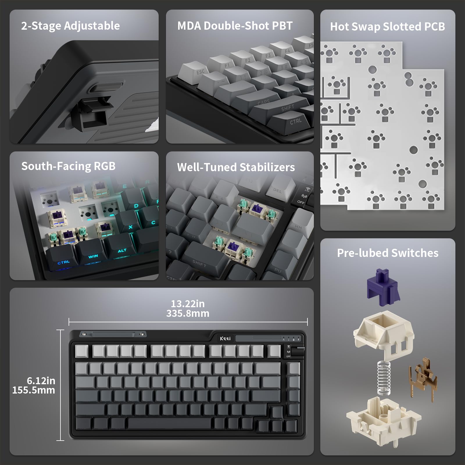 - Q: What is the size of the KZZI K75 Lite keyboard? A: The KZZI K75 Lite features a compact layout with eighty-two keys, which is designed to maximize desk space while still providing a full range of functionality for typing and gaming.