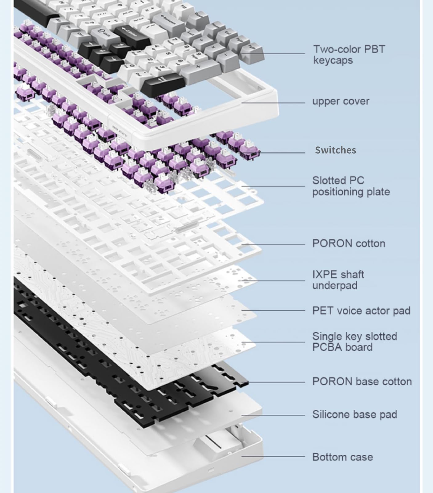 - Q: What materials are used in the construction of the AULA F99 Pro? A: The AULA F99 Pro keyboard is designed with a gasket structure that includes five layers of sound-deadening materials. This construction enhances typing acoustics and provides a stable, comfortable typing feel.