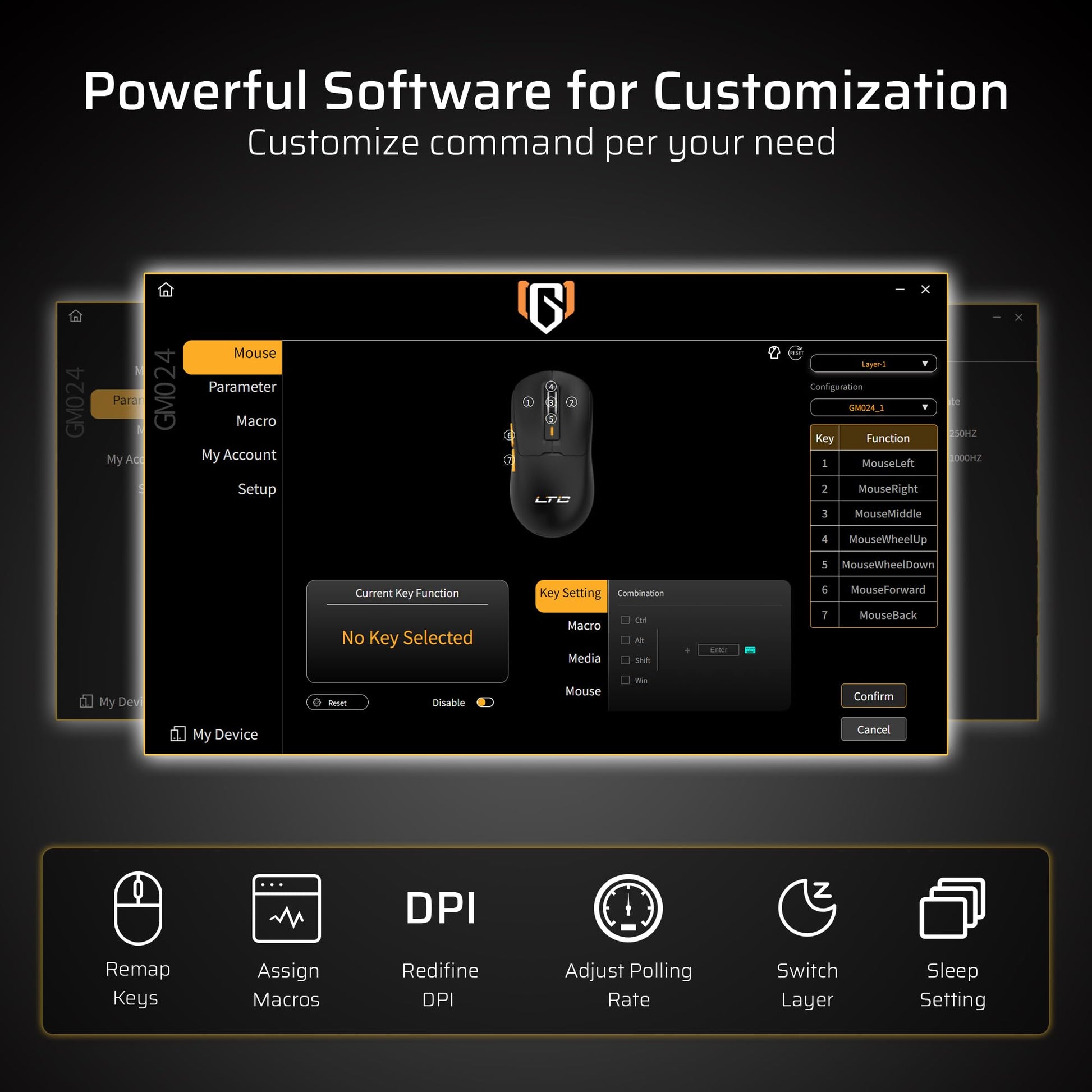 - Q: What type of software is required to utilize the features of the LTC GM024? A: The LTC GM024 mouse requires its proprietary driver software to access features such as macro assignment, key remapping, DPI adjustments, and fine-tuning of the polling rate.