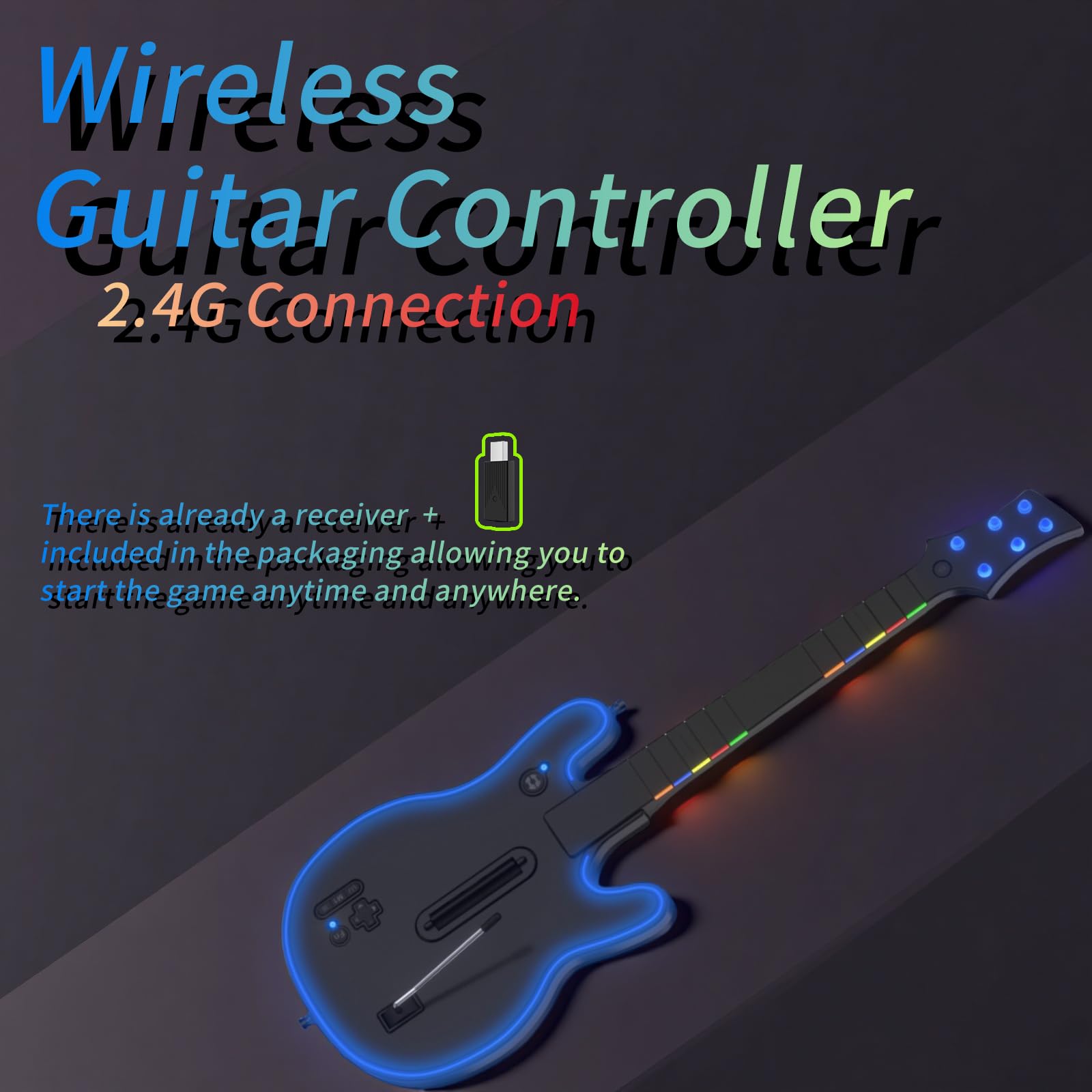 - Q: How does the wireless connection work for this guitar controller? A: The guitar controller uses a dongle for wireless connectivity, which includes an easy-to-pair receiver that enhances the gaming experience by providing a reliable connection.