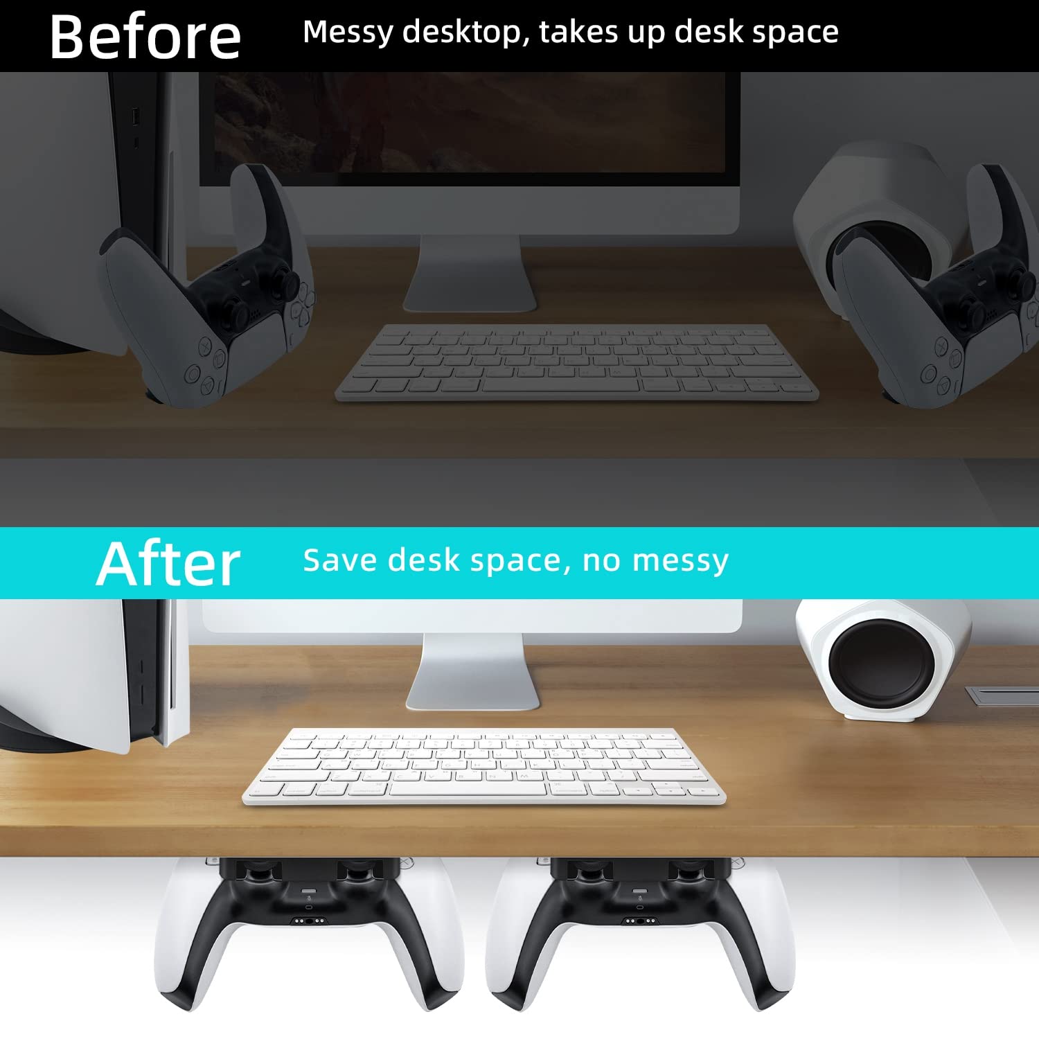 - Q: How much space does the Mcbazel Under Desk Mount save? A: The mount allows you to store your controllers under the desk, freeing up desk space and helping to keep your gaming area organized and clutter-free.