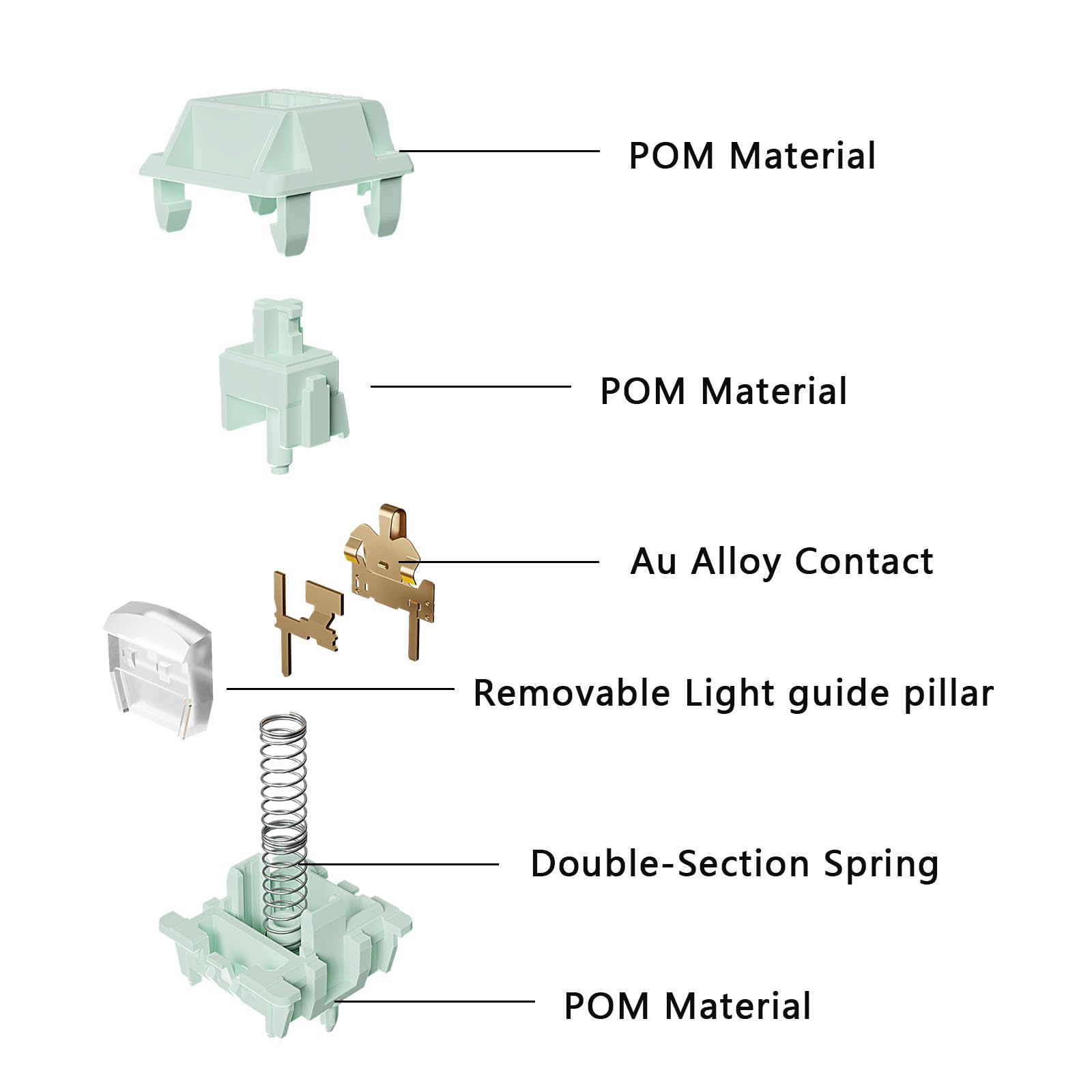 - Q: What features enhance the performance of the Gateron Coral switches? A: These switches feature a removable light guide column for uniform light transmission and original alloy contacts for better conductivity and antioxidant quality.