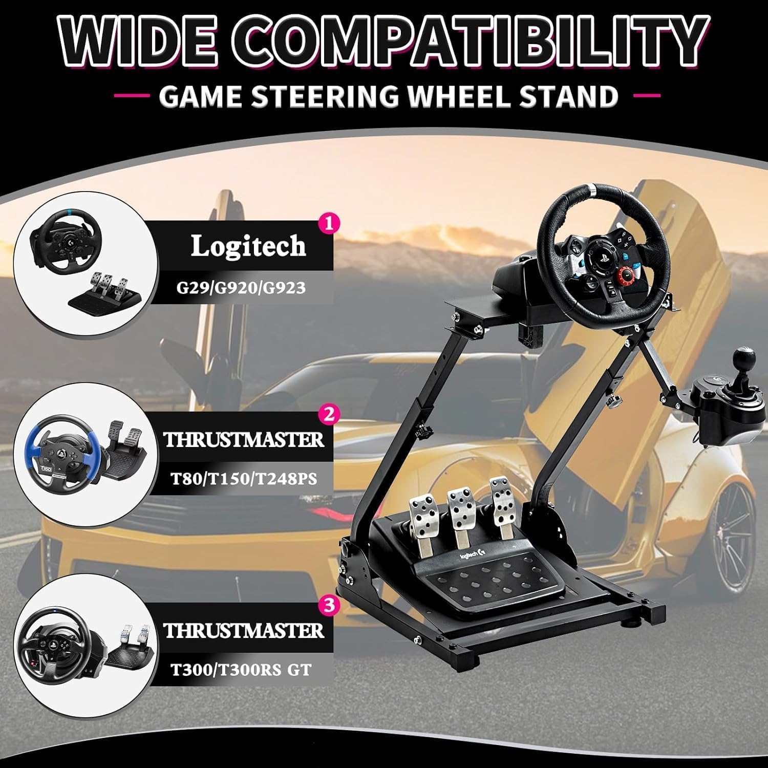 - Q: What racing wheels are compatible with the Minneer Foldable Steering Racing Wheel Stand? A: The Minneer Foldable Steering Racing Wheel Stand is compatible with popular racing wheels, including Logitech models such as G25, G27, G29, G920, and G923, as well as Thrustmaster models like T80, T150, T300RS, TX, T500RS, and F458, F430.