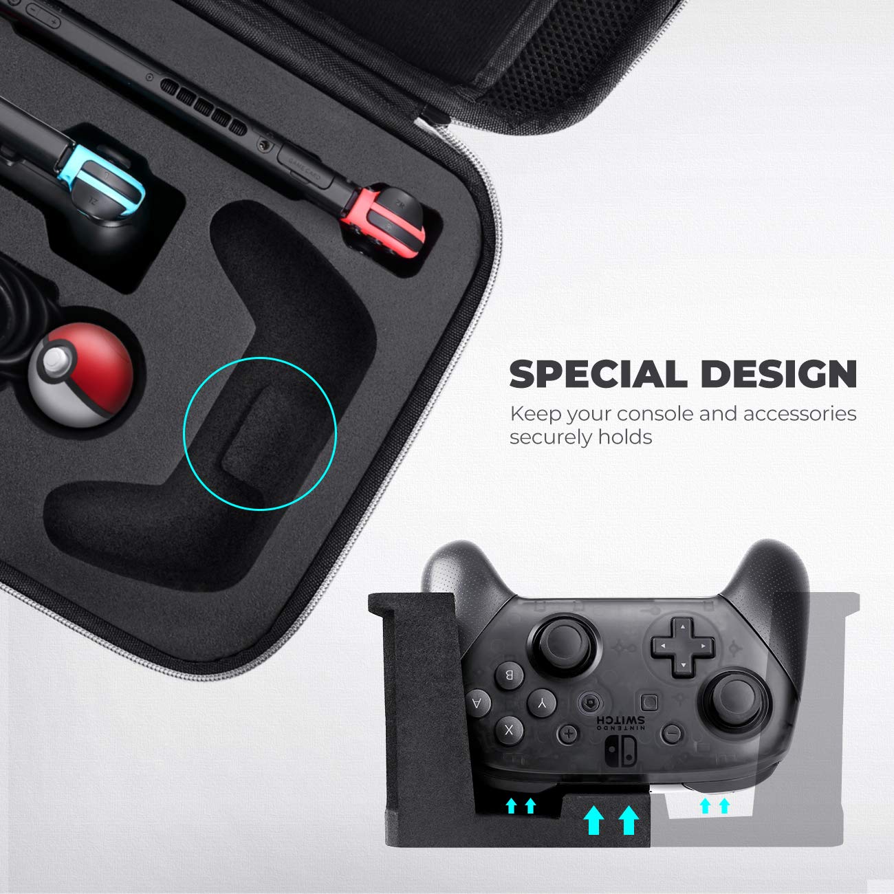 - Q: How does the interior of the Mumba carrying case keep items organized? A: The interior of the Mumba carrying case features separate EVA foam compartments that securely hold your Nintendo Switch gear in place, preventing movement and protecting against bumps and scratches.