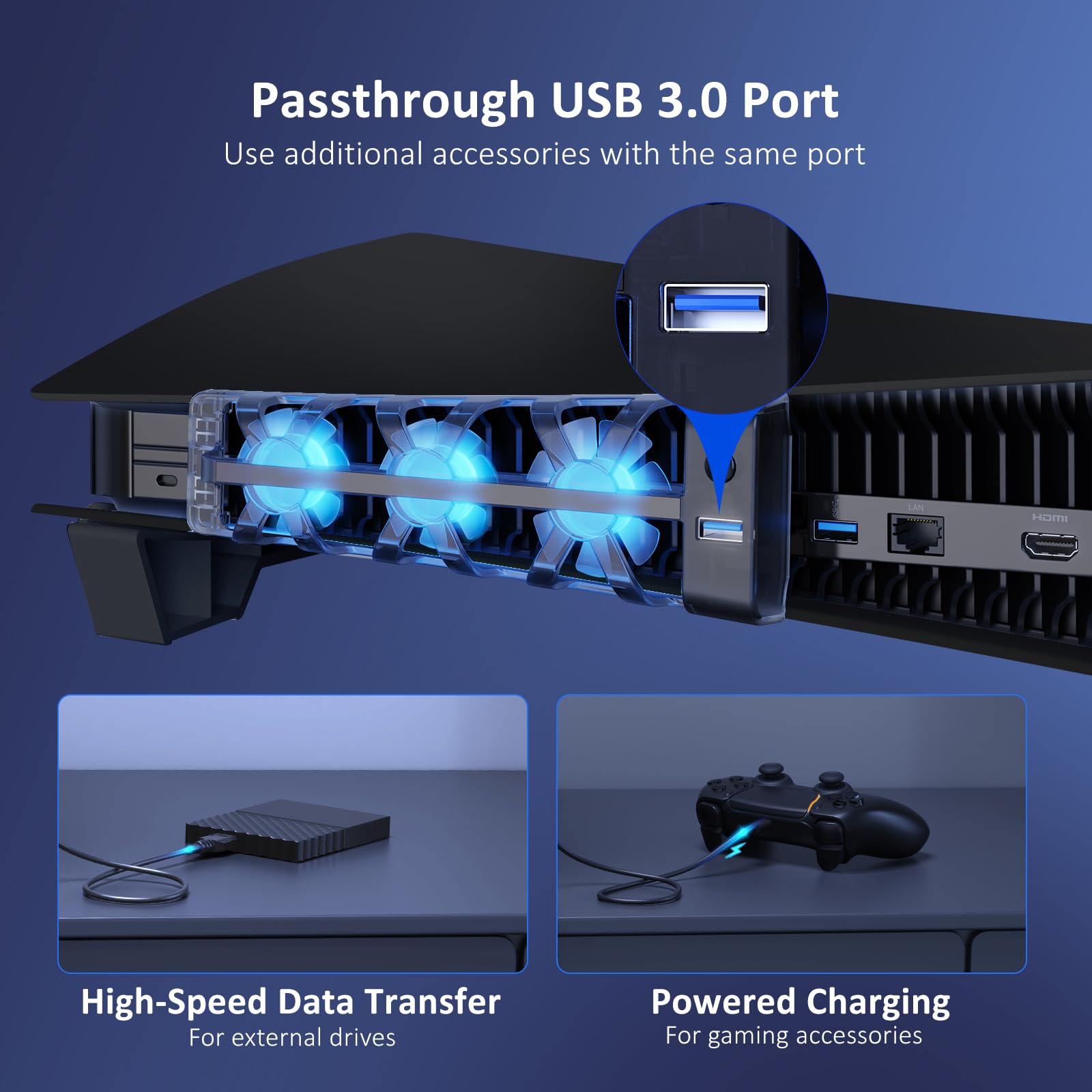 - Q: Does the stand include any additional ports for connectivity? A: Yes, the NexiGo PS5 Stand includes a USB 3.0 passthrough port, allowing users to connect external drives, transfer data, or charge devices while using the console.