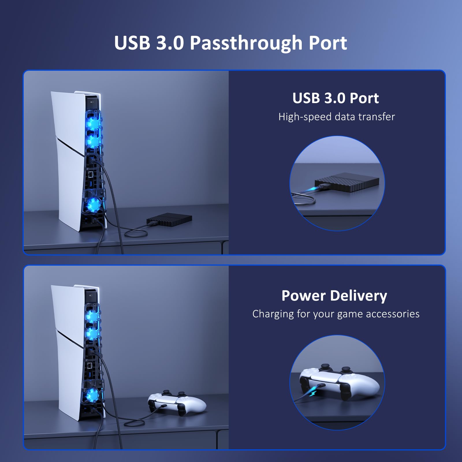 - Q: Can I still use the USB port on my PS5 Slim while using this cooling fan? A: Yes, the cooling fan features a USB 3.0 port, allowing you to continue using the USB-A port for external drives, high-speed data transfers, or charging devices.