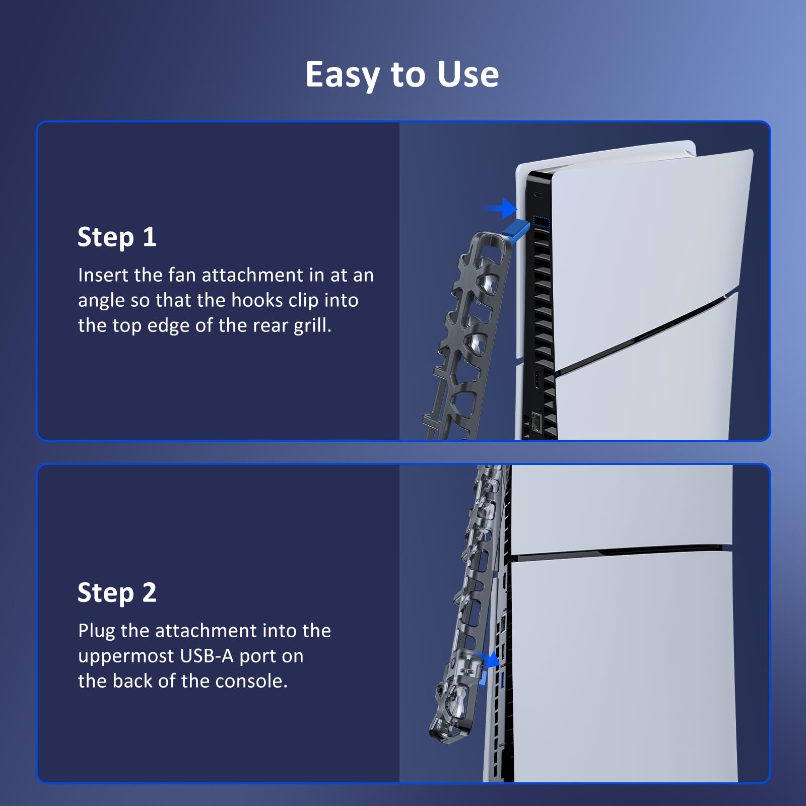 - Q: How does the automatic power feature work on this cooling fan? A: The cooling fan automatically turns off when the PlayStation 5 Slim console is powered down, minimizing energy wastage when not in use.