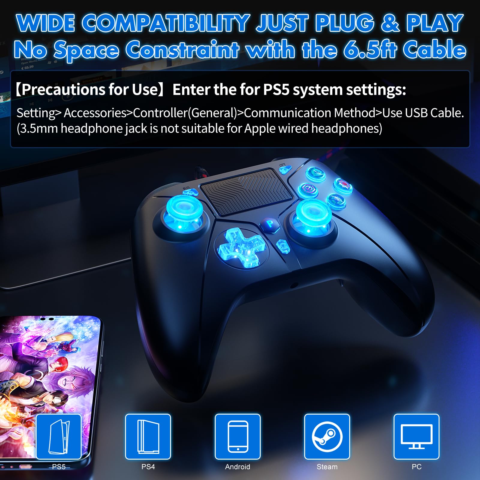 - Q: How should I set up the controller for use with a PS5? A: To set up the controller with a PS5, navigate to Settings > Accessories > Controller (General) > Communication Method and select 'Use USB Cable' for proper functionality.