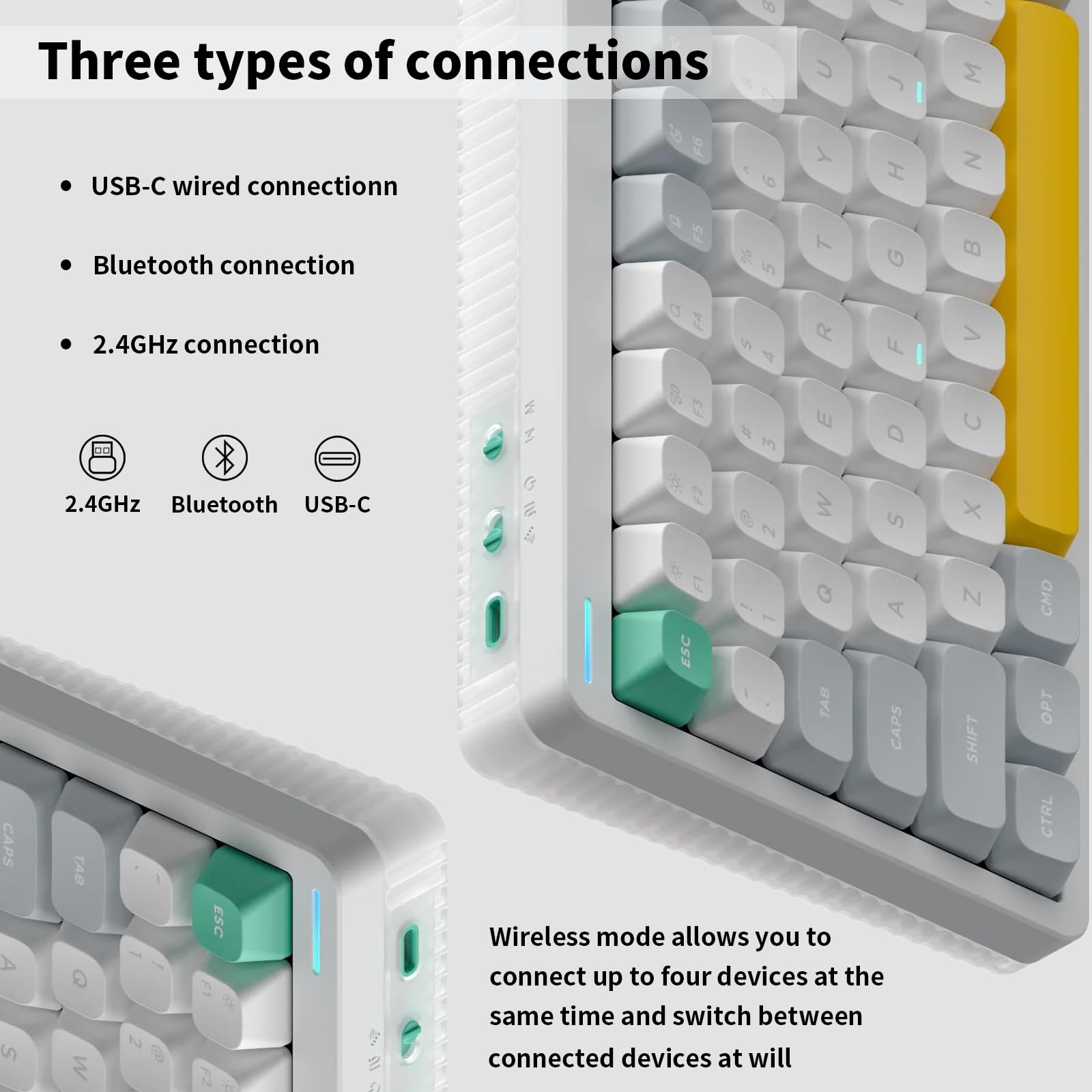 - Q: How does the wireless connectivity work on the Halo75 V2? A: The Halo75 V2 supports Bluetooth, 2.4GHz, and USB-C connectivity, allowing connection to up to four devices simultaneously. Users can easily switch between devices for seamless operation across multiple platforms.