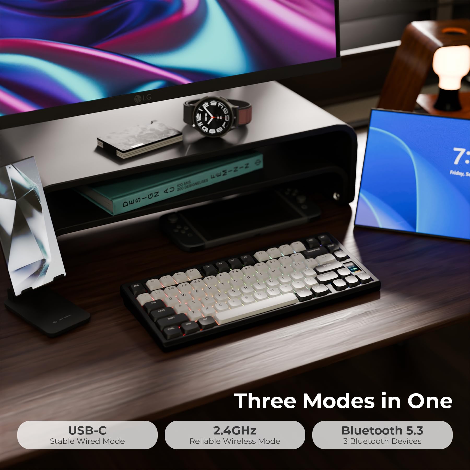 - Q: How does the LCD screen enhance my experience with the keyboard? A: The integrated LCD screen displays important information such as battery life, connection status, date, and time. It can also show customizable graphics, allowing you to personalize your setup while keeping essential details visible.