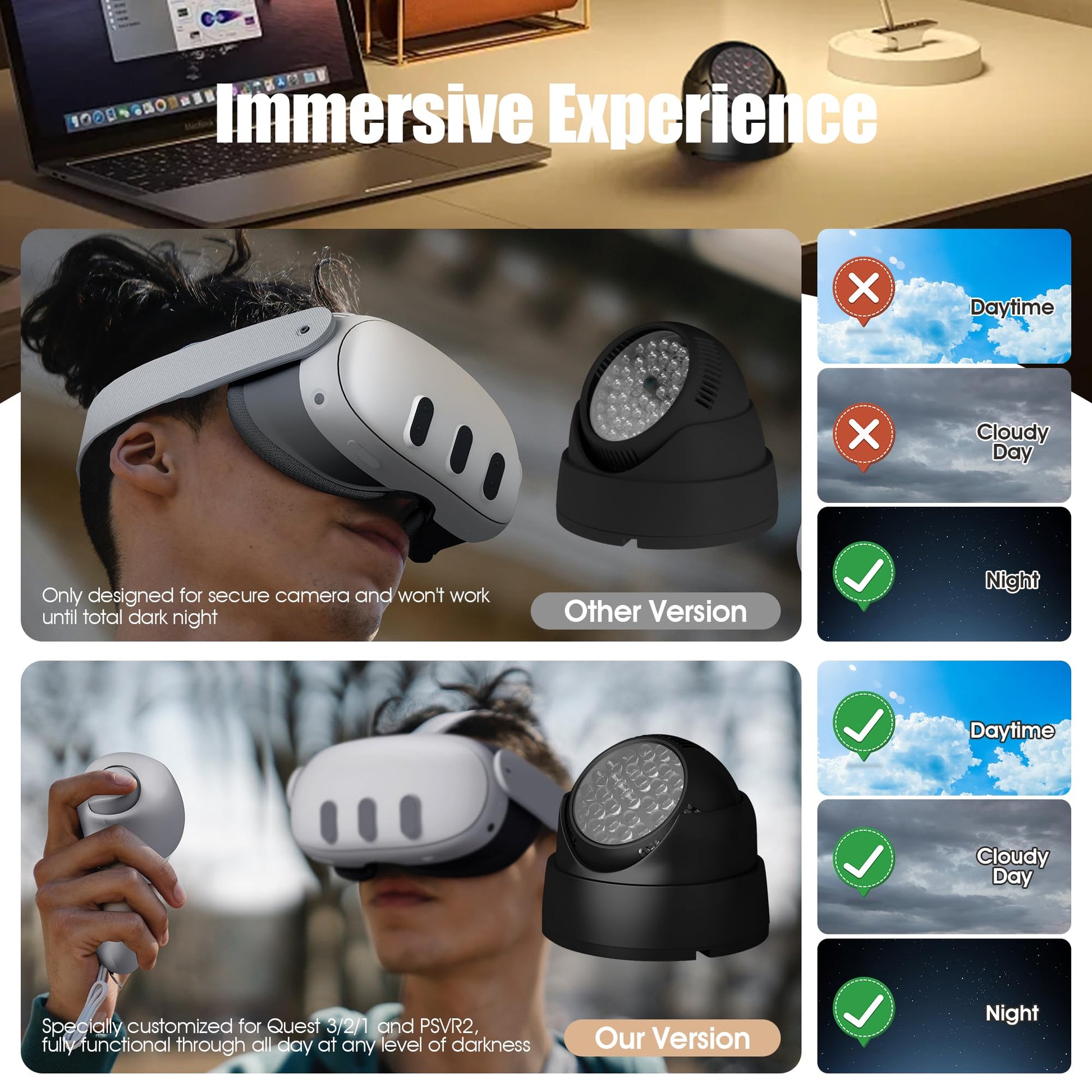 - Q: What is the benefit of using infrared light for VR gaming? A: Infrared light allows you to play VR games in total darkness without disturbing others, as the invisible light enhances tracking without visible illumination.