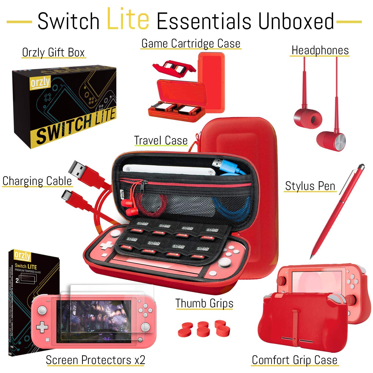 - Q: What accessories are included in the Orzly Switch Lite Accessories Bundle? A: The Orzly Switch Lite Accessories Bundle includes a protective case, tempered glass screen protectors, a USB charging cable, earphones, a DuoPen stylus, a comfort grip case, and a games storage case.