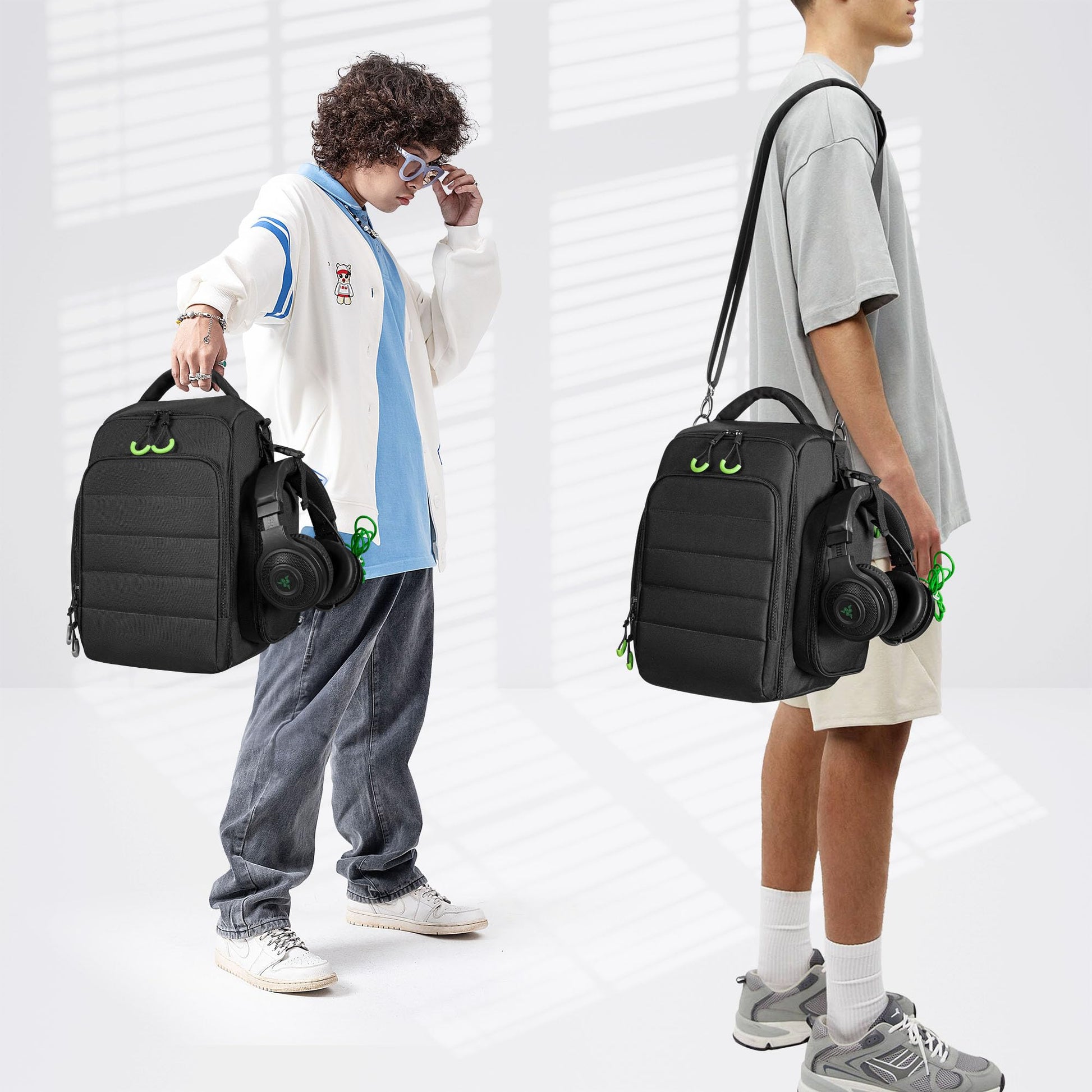 - Q: How much storage space does the case provide for accessories? A: The carrying case offers spacious storage with multiple independent compartments. It includes a front pocket for game discs, two side pockets for controllers and cables, and a back pocket for personal items like keys or a cell phone.