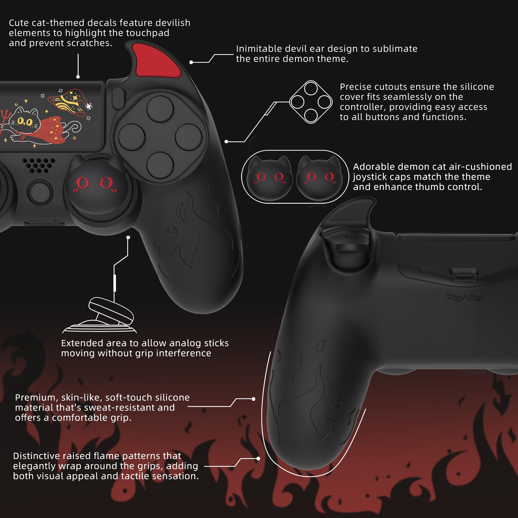 - Q: What additional accessories come with the controller skin? A: The package includes one silicone case, a pair of demon cat thumb grips, and two matching touchpad stickers for a complete look.